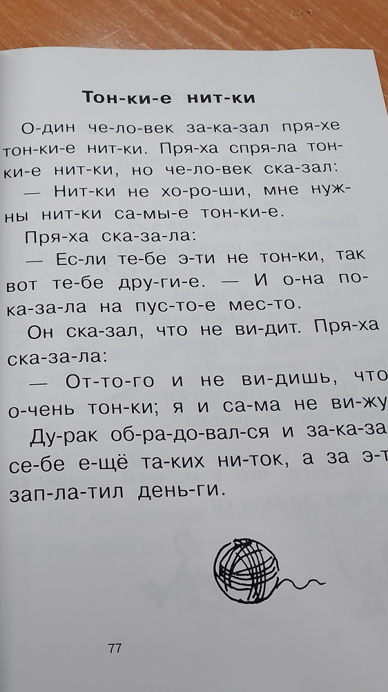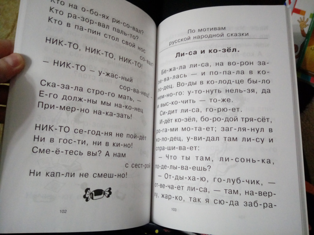 Книга просто замечательная. Весь текст прописан по слогам, что очень удобно для учения чтению.