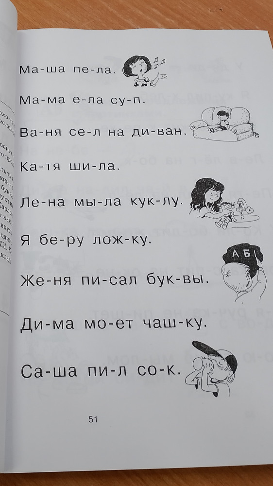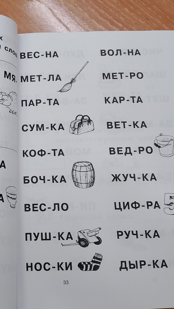 Книга выполнена на тонкой серой бумаге, листочки очень нежные. Картинки есть но все черно белое. Ребёнок быстро научился читать.