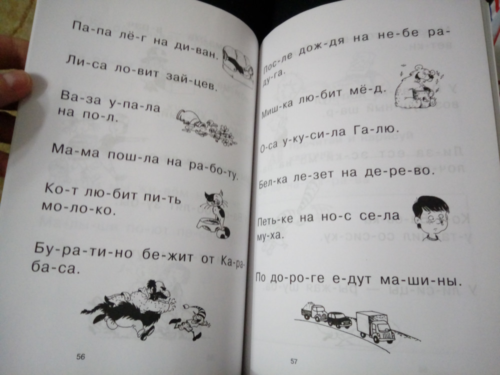 Книга покупалась по требованию школьного учителя. Ребенок уже умеет читать, так что про обучение чтению по ней ничего сказать не могу. А вот для закрепления навыков книга неплоха. Тексты небольшие, крупный шрифт. Правда страницы тонковаты и просвечивают.