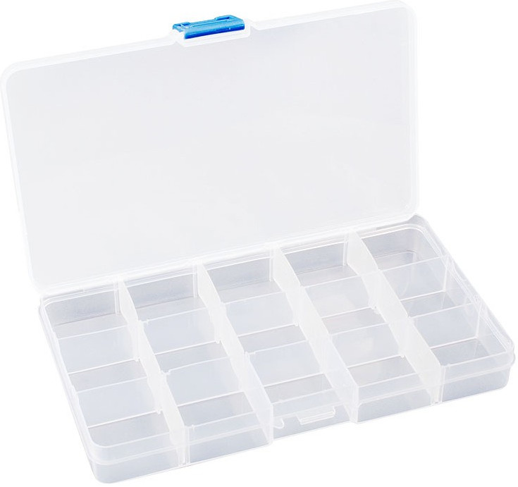 Органайзер небольшого размера, 15 ячеек. Взяла для алмазной мозаики, удобно в использовании, разложила по ячейкам 15 цветов, чтобы не надо было каждый раз доставать из пакетиков. Заказала еще один.