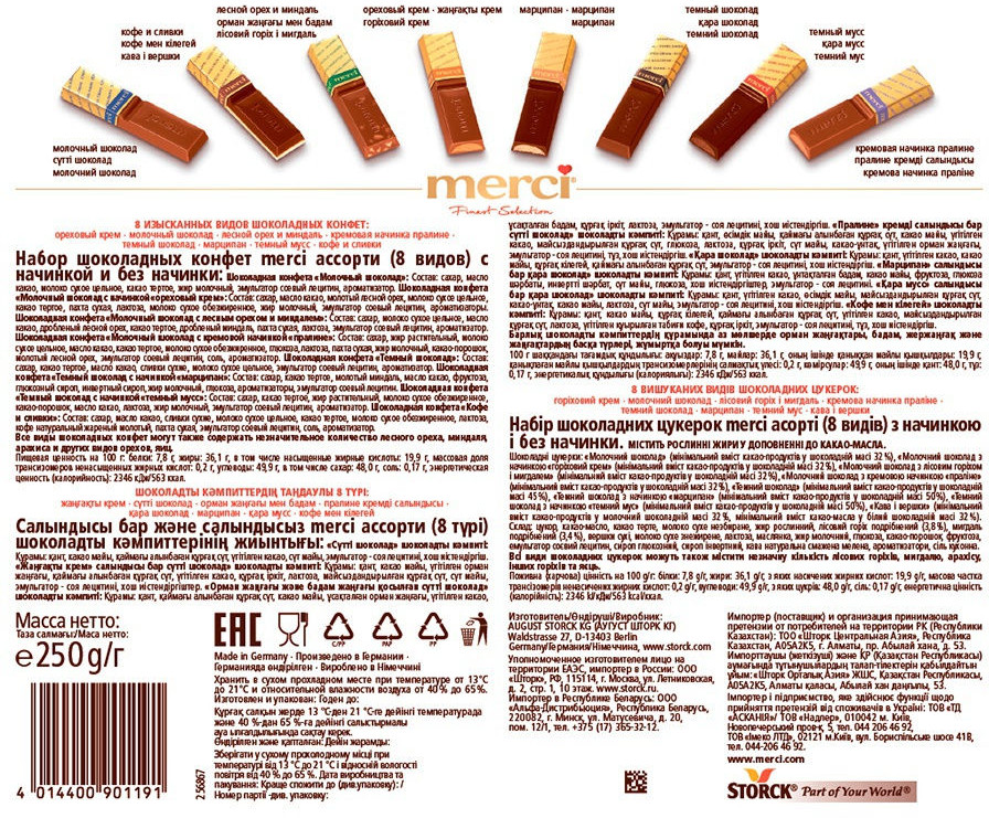 • шоколадная конфета «Молочный шоколад с лесным орехом и миндалем»: сахар, молоко сухое цельное, масло какао, дробленый лесной орех, какао тертое, дробленый миндаль, пахта сухая, лактоза, эмульгатор соевый лецитин, ароматизатор;