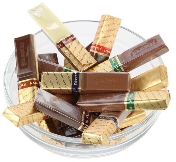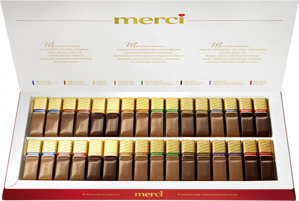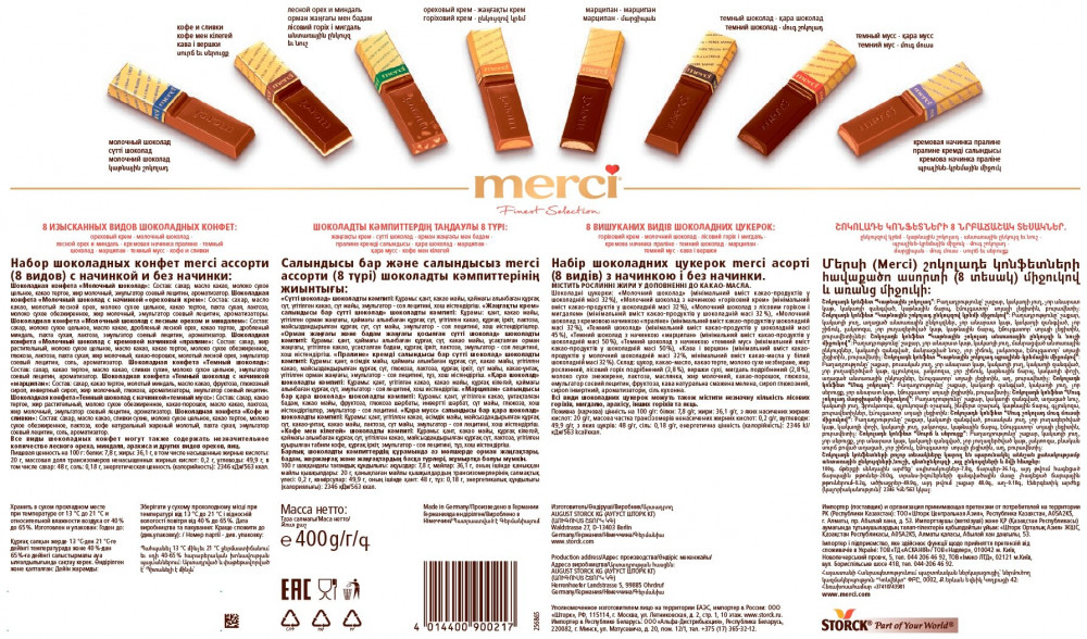 • шоколадная конфета «Молочный шоколад с кремовой начинкой пралине»: сахар, жир растительный, молоко сухое цельное, масло какао, какао тертое, молоко сухое обезжиренное, глюкоза, лактоза, пахта сухая, жир молочный, какао-порошок, молотый лесной орех, эмульгатор соевый лецитин, соль, ароматизатор;