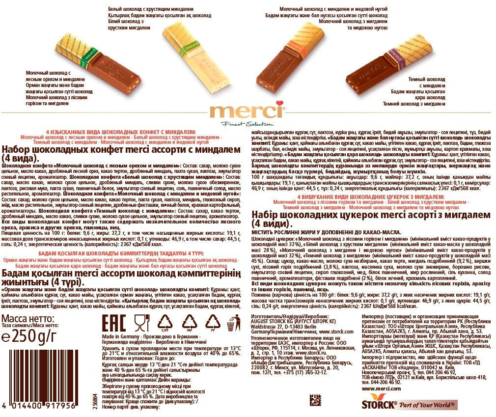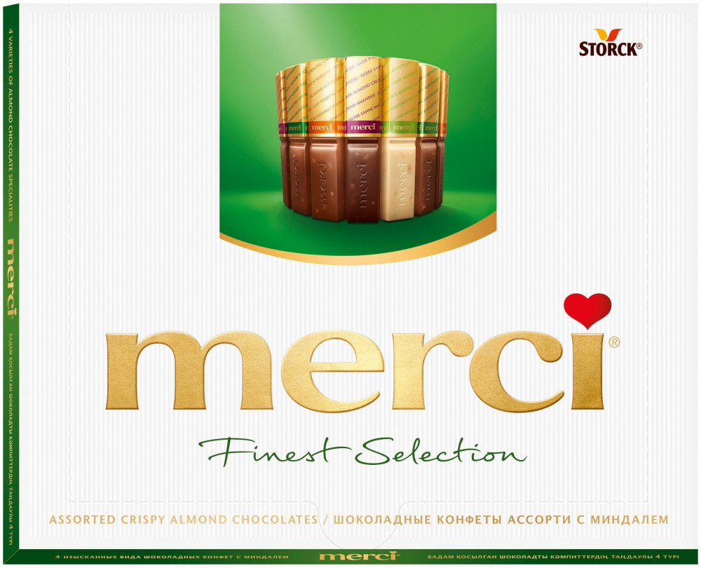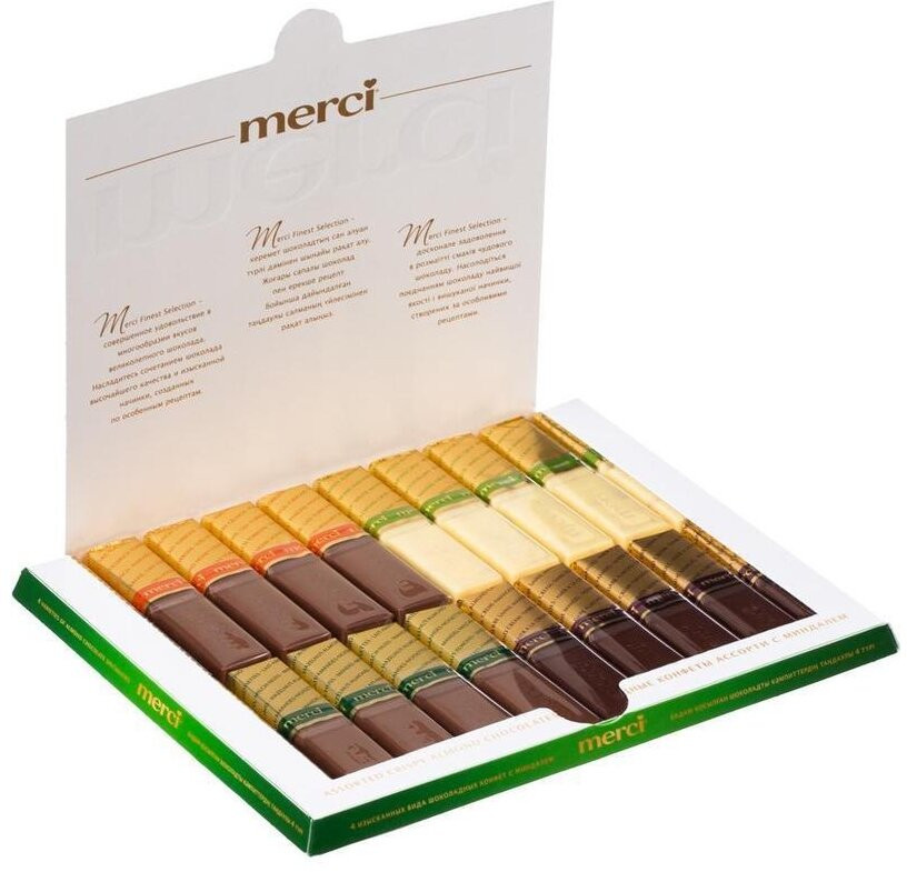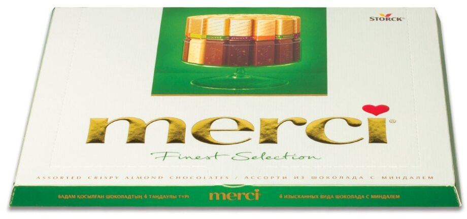 Merci Конфеты с миндалем шоколадные ассортиВ данный момент этот товар отсутствует в продаже. Возможно, у нас найдется аналогичный или похожий товар здесь. Серия: Finest Selection Шоколад Merci — это великолепное ассорти из уникальной коллекции изысканного шоколада, для производства которого используются ингредиенты высокого качества. Четыре изысканных вида шоколадных конфет с миндалем: молочный шоколад с лесным орехом и миндалем; белый шоколад с хрустящим миндалем; молочный шоколад с миндалем и медовой нугой; темный шоколад с миндалем. |