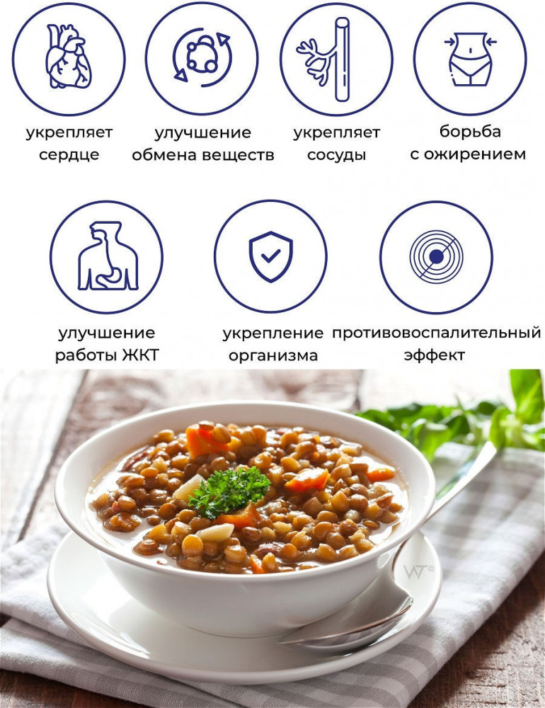 Зелёная чечевица – представитель бобовых. Имеет тёмно-зелёный цвет. В готовом к употреблению виде по консистенции напоминает варёный горох. Только, чечевица намного нежнее на вкус и обладает тонким пряно-перечным ароматическим оттенком. Зелёную чечевицу употребляют в варёном, тушеном, пророщенном виде. Это полезный ингредиент для салатов и других вариантов блюд на основе бобовых зёрен или пюре. Зелёная чечевица: польза для организма снижает риски развития инсультов; предупреждает развитие анемии; укрепляет костные, хрящевые ткани; блокирует негативное влияние свободных радикалов; мягко снижает артериальное давление; помогает сдерживать скачки сахара в крови при диабете; способствует развитию, укреплению мышечной ткани. Зелёная чечевица содержит большое количество пищевых волокон и клетчатки. Именно этот вариант бобовых выбирают для улучшения работы пищеварительной системы, профилактики запоров. Продукт также является источником полезного растительного белка, который необходим организму для строительства клеток. противопоказания воспалительные процессы в кишечнике; заболевания опорно-двигательного аппарата; гормональные сбои; склонность к метеоризму; болезни почек, ХПН; период грудного вскармливания; детский возраст до 5 лет. Основная проблема усвоения зелёной чечевицы заключается в том, что продукт вызывает повышенное газообразование. Непроходимость кишечника, послеродовой, послеоперационный период, угроза прерывания беременности является абсолютным противопоказанием для употребления зелёной чечевицы. Супчик из неё обалденный. Мне больше горохового нравится. У кого инсулинорезистентность - заценят. После обеда с чечевицей нет слабости, сонливости, тяжести. Всем здоровья! Спасибо ФЛИП!