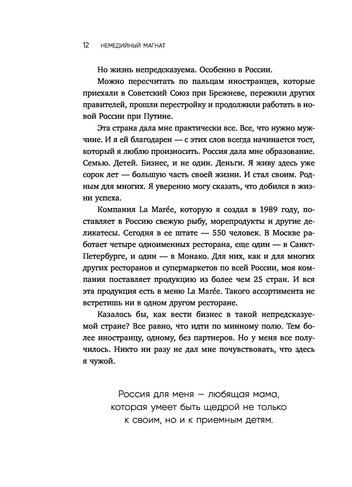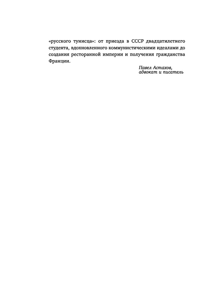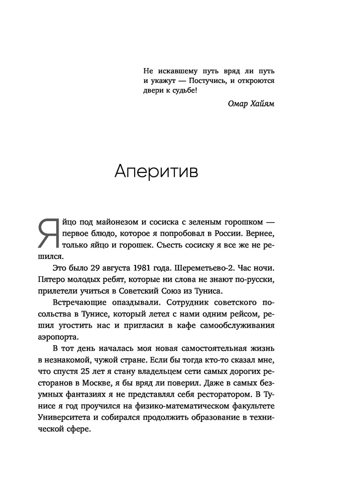 Серия: Книги-драйверы Он стал одним из самых успешных бизнесменов России, приехав в СССР студентом из Туниса. Променял карьеру в Швеции на любовь, возродил лесную промышленность и стал первым поставщиком морепродуктов в нашей стране. Построил сеть лучших рыбных ресторанов, обойдя конкурентов и преодолев все ловушки постсоветского пространства.