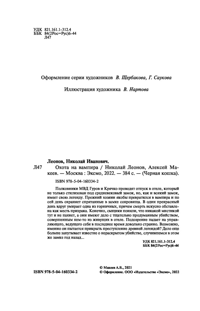 Серия: Черная кошка Полковники МВД Гуров и Крячко проводят отпуск в отеле, который не только стилизован под средневековый замок, но, как и всякий замок, имеет свою легенду. Прежний хозяин якобы превратился в вампира и по сей день охраняет спрятанные в замке сокровища. В один прекрасный день вдруг умирает одна из горничных, причем смерть искусно обставлена как месть призрака. |
