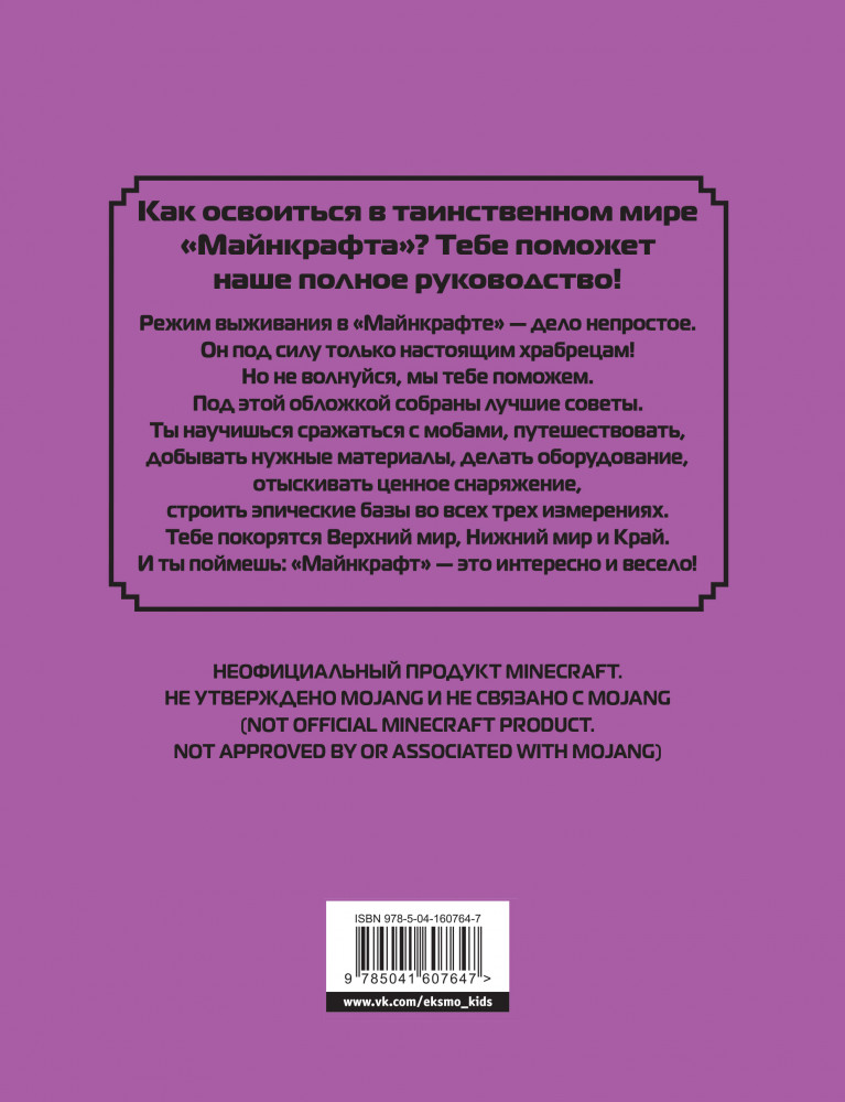 💳 Оплатить за товар можно при получении 🇰🇿 Есть бесплатная доставка по Казахстану от 1 дня 🎁 Копите бонусы с каждой покупки Серия: Minecraft. Книги для фанатов Как освоиться в таинственном мире «Майнкрафта»? Тебе поможет наше полное руководство! Режим выживания в «Майнкрафте» — дело непростое. Он под силу только настоящим храбрецам! Но не волнуйся, мы тебе поможем. Под этой обложкой собраны лучшие советы. Ты научишься сражаться с мобами, путешествовать, добывать нужные материалы, делать оборудование, отыскивать ценное снаряжение, строить эпические базы во всех трех измерениях. Тебе покорятся Верхний мир, Нижний мир и Край. И ты поймешь: «Майнкрафт» — это интересно и весело! |
