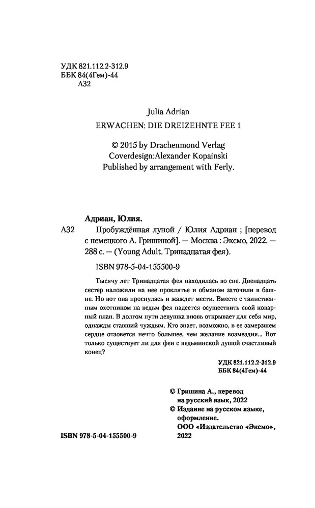 Пробуждённая лунойВ данный момент этот товар отсутствует в продаже. Возможно, у нас найдется аналогичный или похожий товар здесь. Серия: Young Adult. Тринадцатая фея Тысячу лет Тринадцатая Фея находилась во сне. Двенадцать сестер наложили на нее проклятье и обманом заточили в башне. Но вот она проснулась и жаждет мести. Вместе с таинственным охотником на ведьм Фея надеется осуществить свой коварный план. В долгом пути девушка вновь открывает для себя мир, однажды ставший чуждым. Кто знает, возможно, в ее замерзшем сердце отзовется нечто большее, чем желание возмездия... Вот только существует ли для феи с ведьминской душой счастливый конец? |