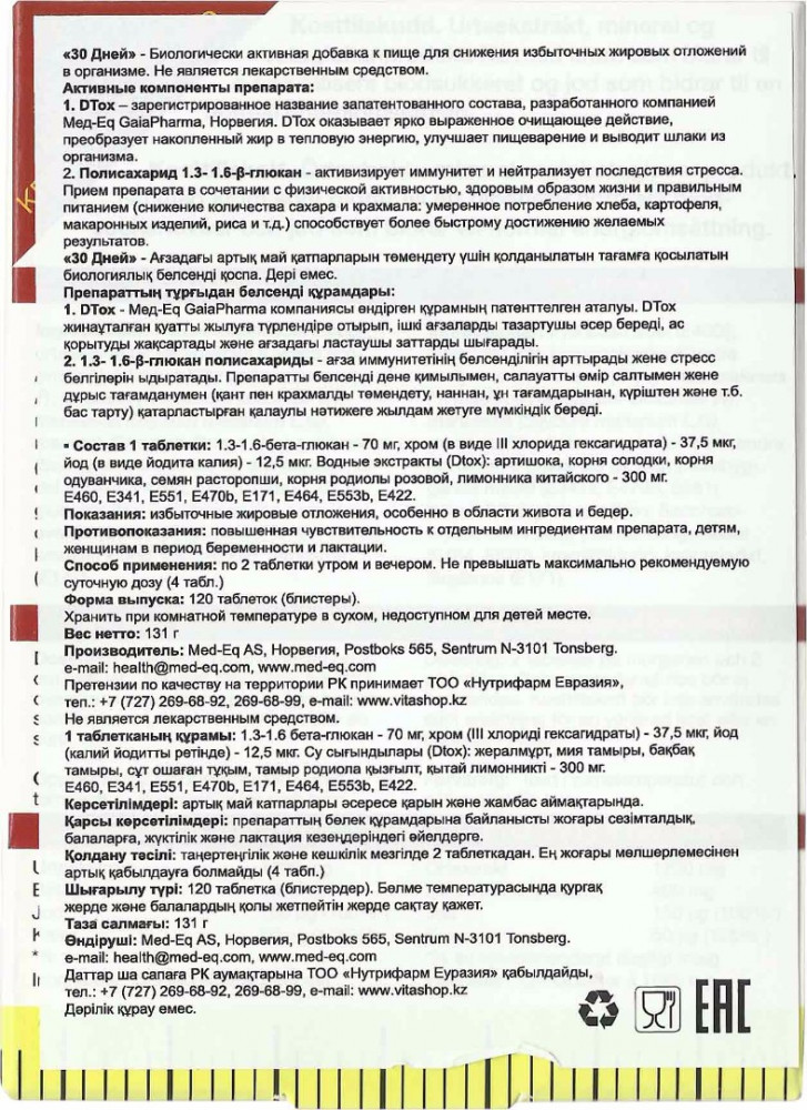 Immitec Биологически активная добавка «30 days»В данный момент этот товар отсутствует в продаже. Возможно, у нас найдется аналогичный или похожий товар здесь. Вы находитесь на верном пути, если выбрали для похудения препарат «30 days». Снижает негативное влияние абдоминального жира на весь ваш организм. Препарат «30 days» содержит уникальную запатентованную формулу DTox тм, разработанную специалистами компании Med-Eq Gaiapharma, Норвегия. DTox тм включает в себя растительные экстракты, которые очищают и укрепляют пищеварительную систему, стимулируют выведение из организма шлаков и токсинов. Входящие в состав препарата «30 days» полисахариды поддерживают и стимулируют иммунную систему. |