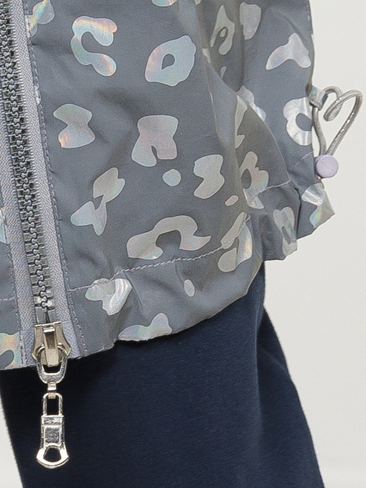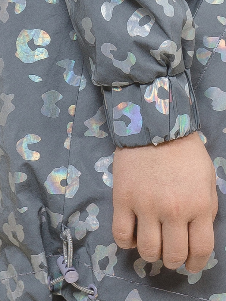 Ветровка на тонком подкладе. Рекомендуемый температурный режим не ниже плюс 10 градусов. Ткань со световозвращающим покрытием и голограммным серебряным металликом. Водоотталкивающее покрытие. Куртка силуэта бочонок с сильно спущенной линией плеча и объемным рукавом. Карманы прорезные с листочкой. Тракторная молния с серебряным напылением. Стопперы в капюшоне декорированы надписью с серебряным покрытием. Объем по низу изделия регулируется эластиком со стопперами.