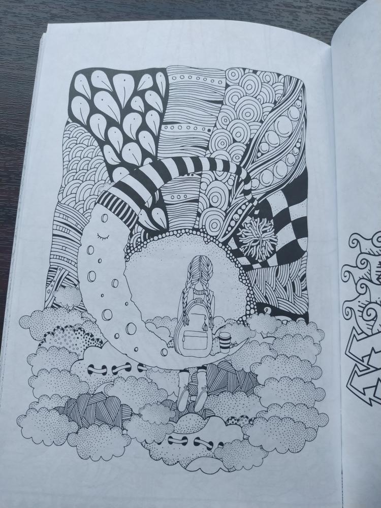 Очень классные картинки! Много мелких деталей. Бумага плотная, но думаю, просвечивать будет в любом случае. Плотный переплет, тяжело раскрывать книжку и надо придерживать рукой.