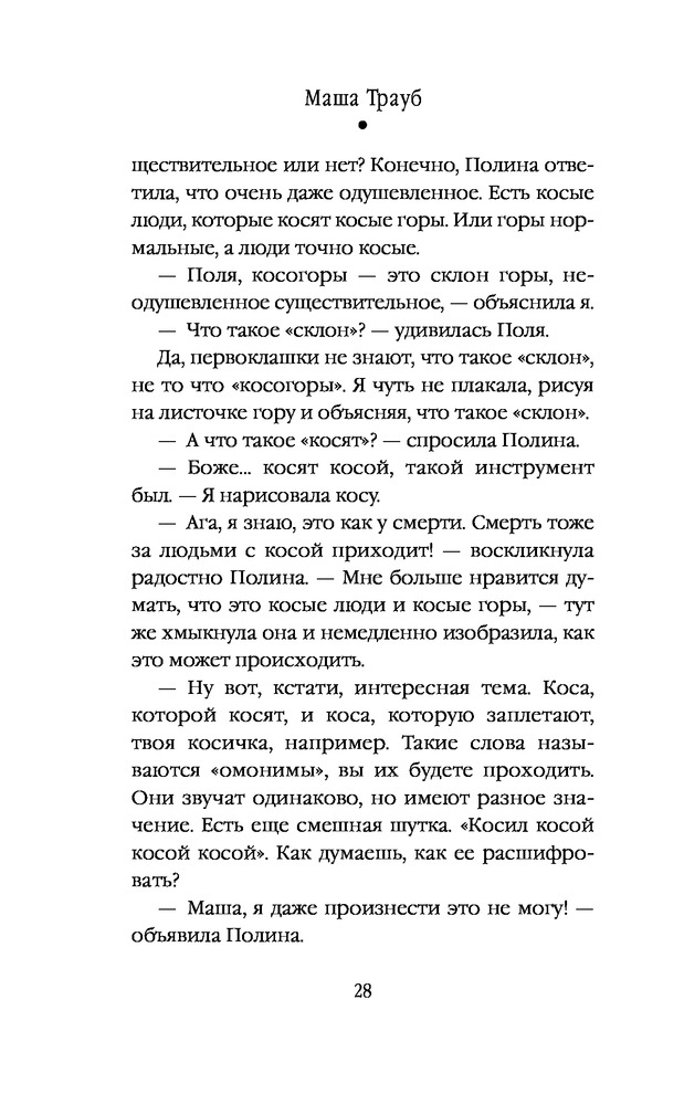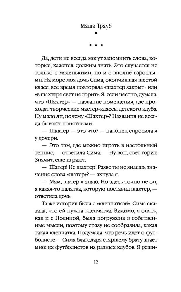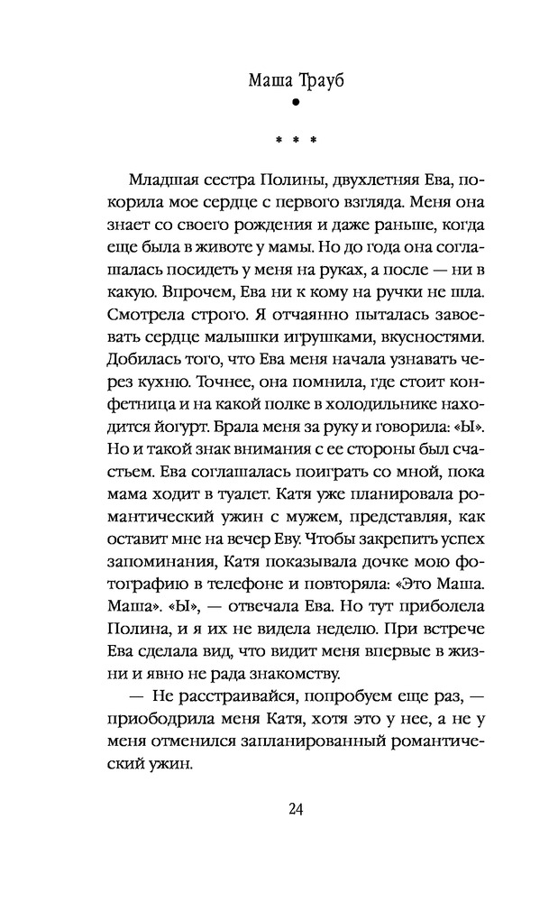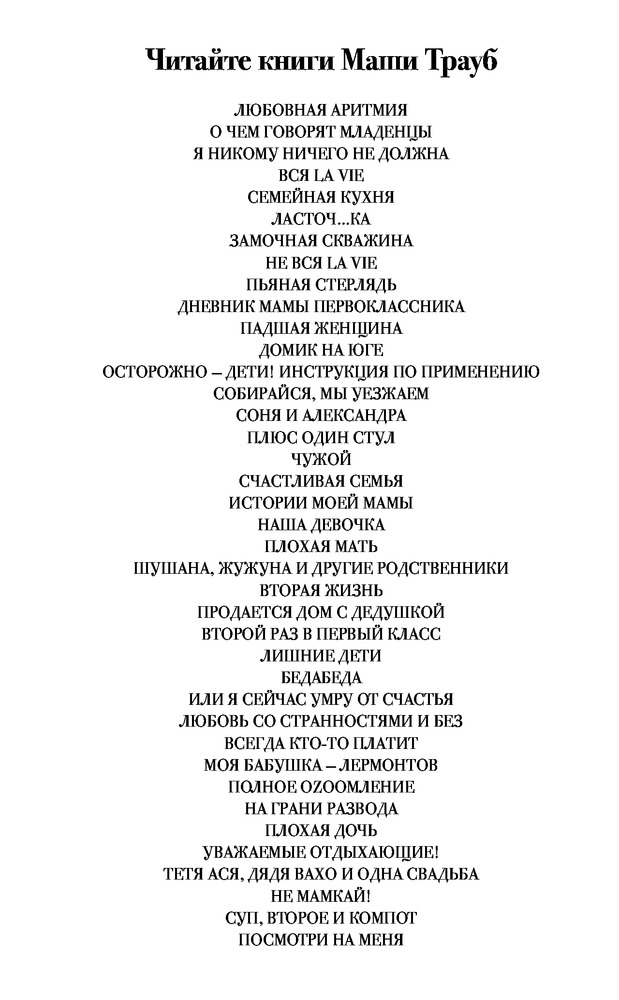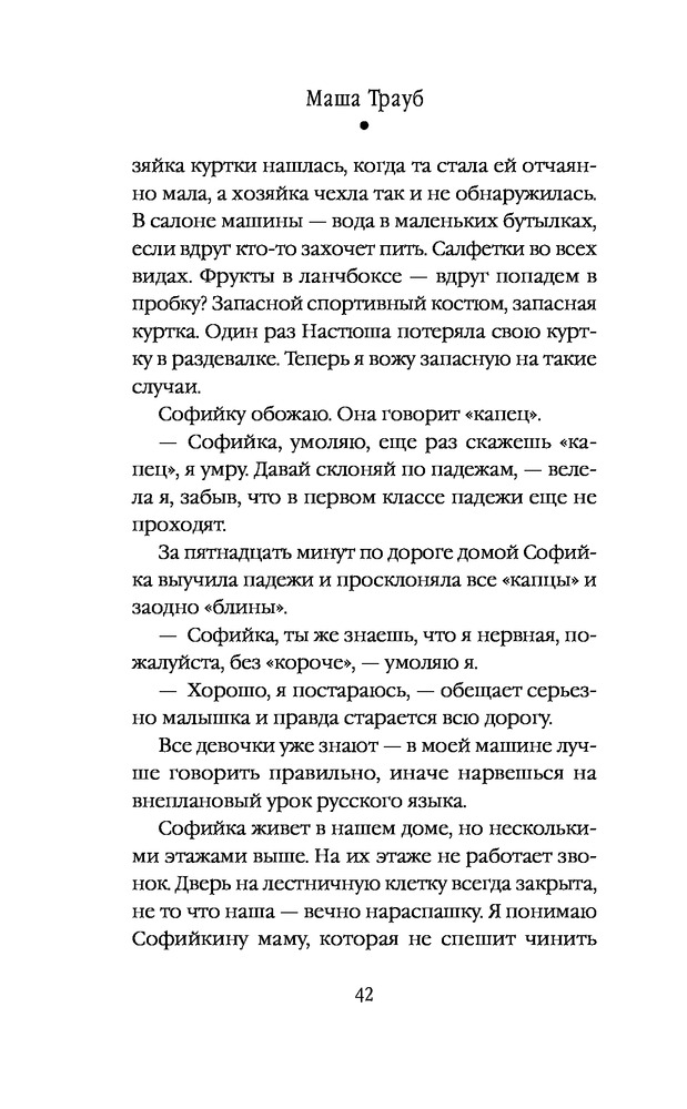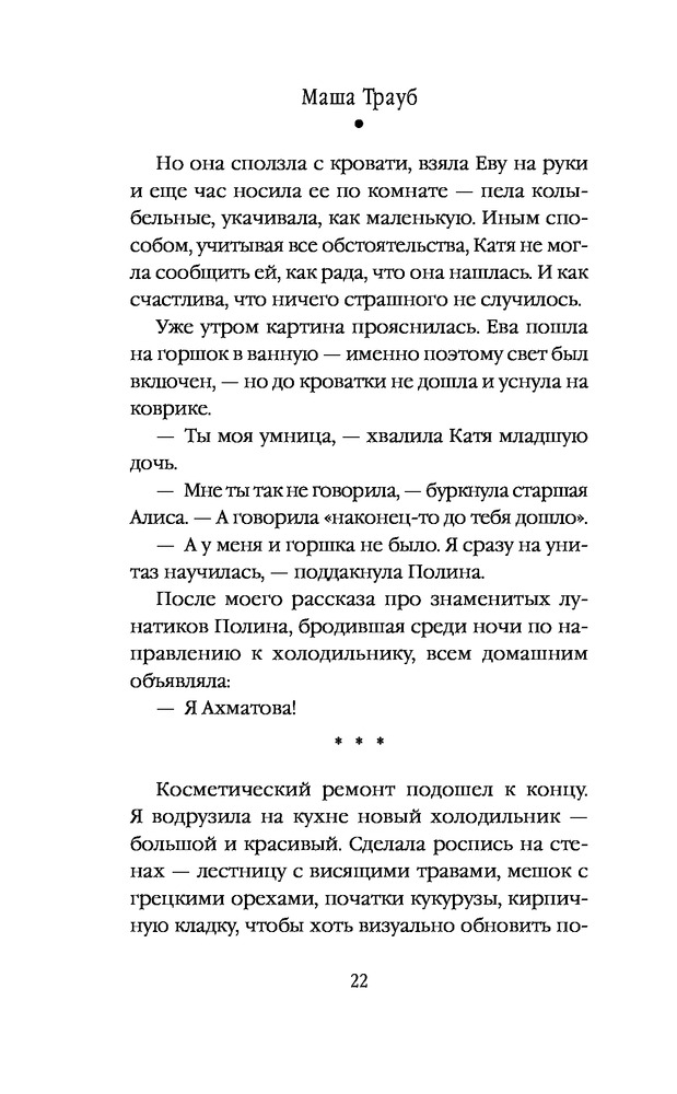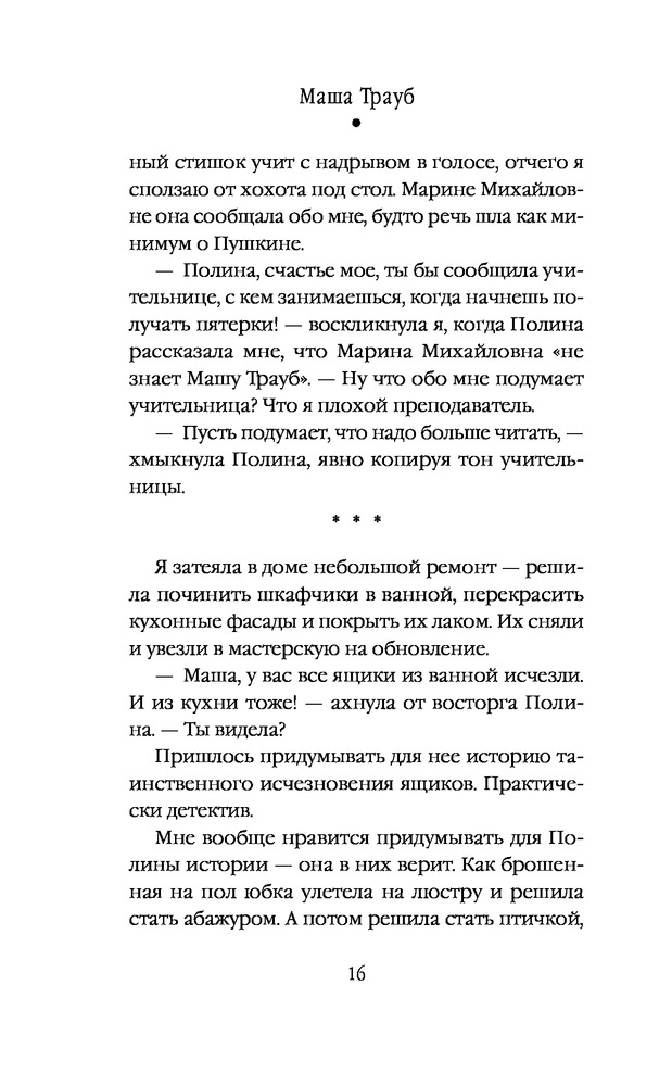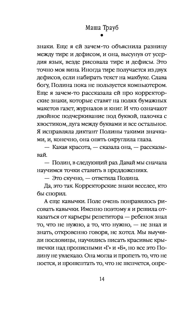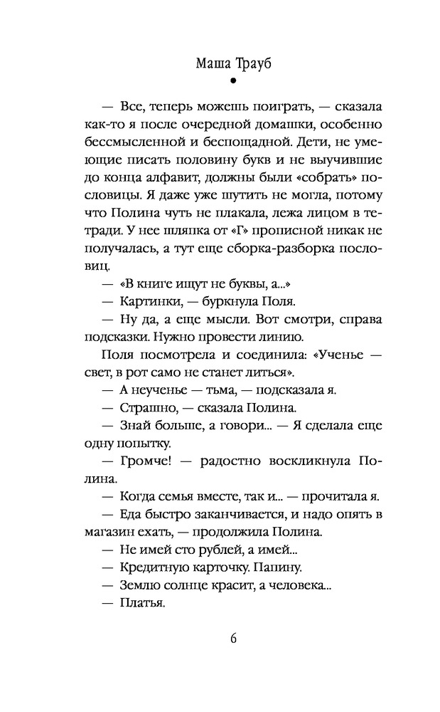 Серия: Проза Маши Трауб. Жизнь как в зеркале Эта книга сложилась из тех самых пресловутых пометок в блокноте, о которых так часто спрашивают читатели. Пометки я делаю редко, потому что все равно забываю, куда записала. Даже этот блокнот сохранила лишь по той причине, что в нем рисовала двухлетняя малышка, дочь моей подруги, а ее сестра-первоклассница придумывала собственный шрифт. В этом же блокноте я писала для нее смешные рифмы и объясняла разницу между твердым и мягким знаками, которые первоклашке казались одинаковыми. |
