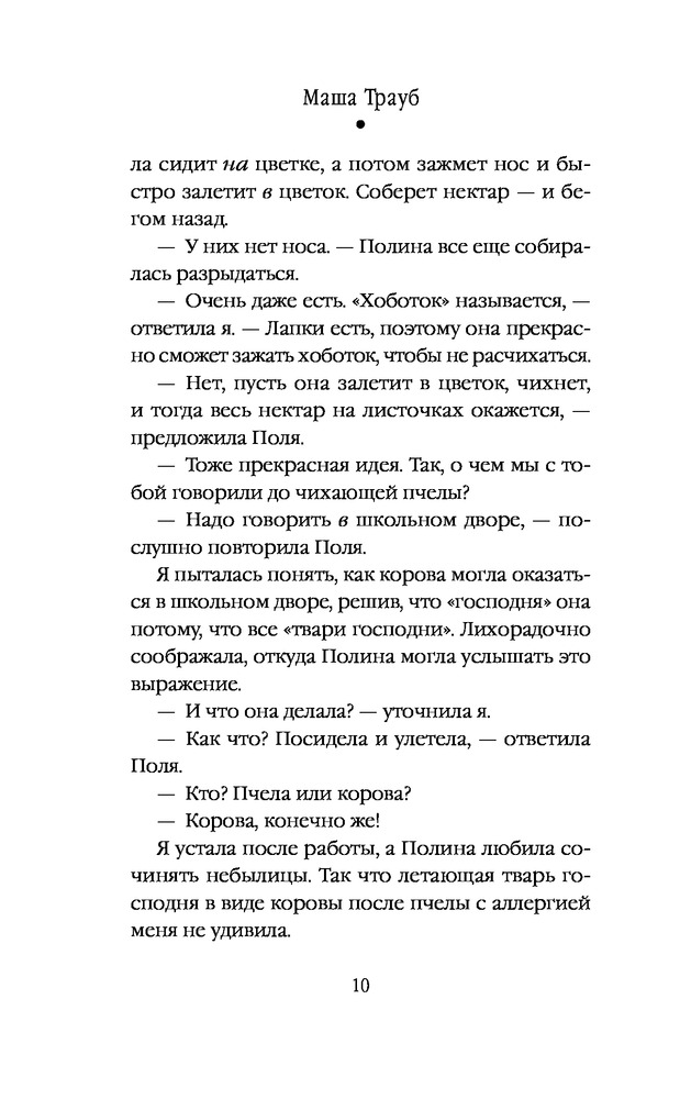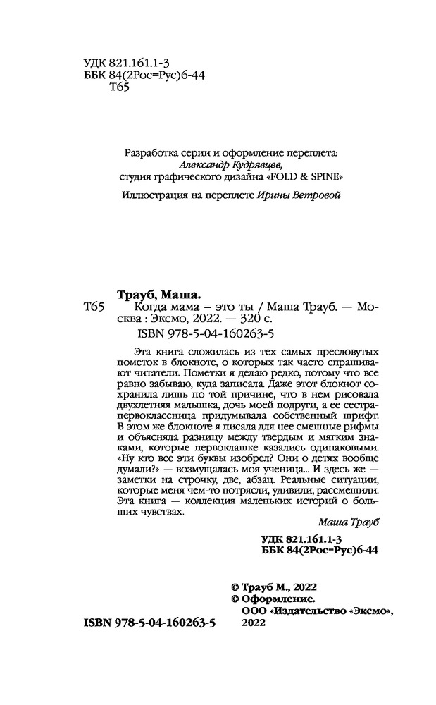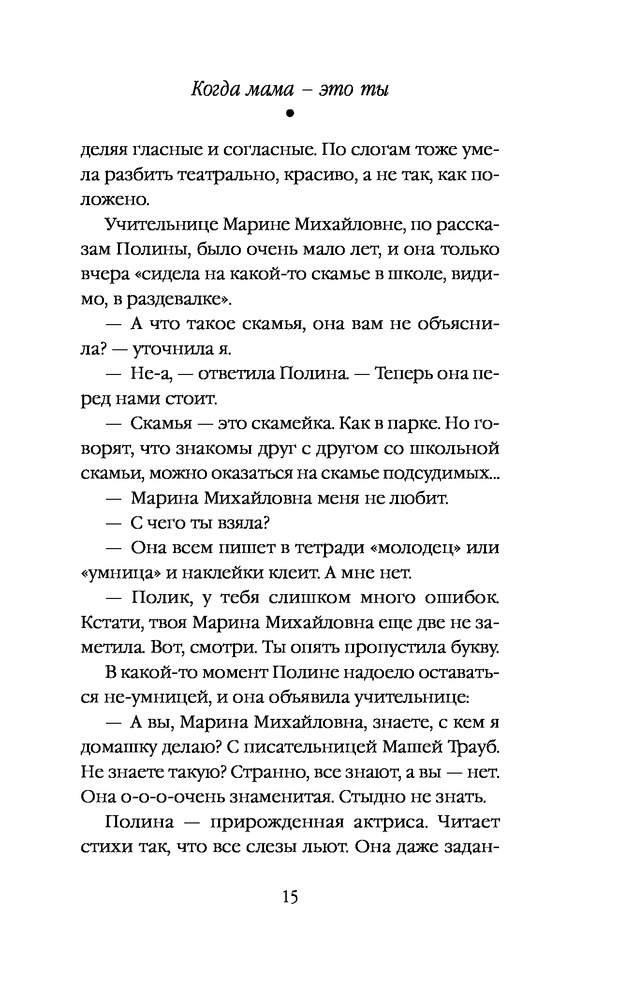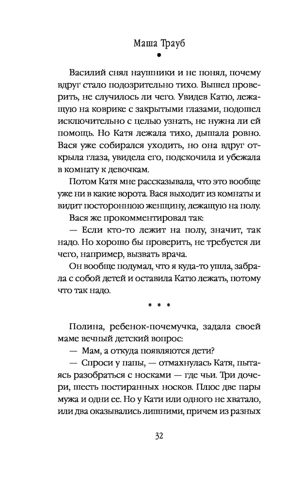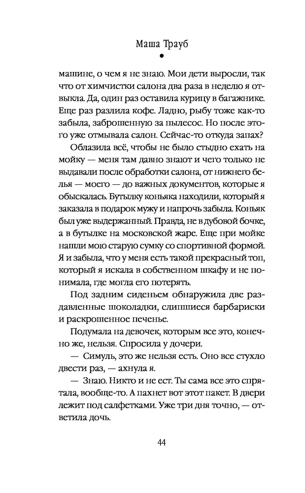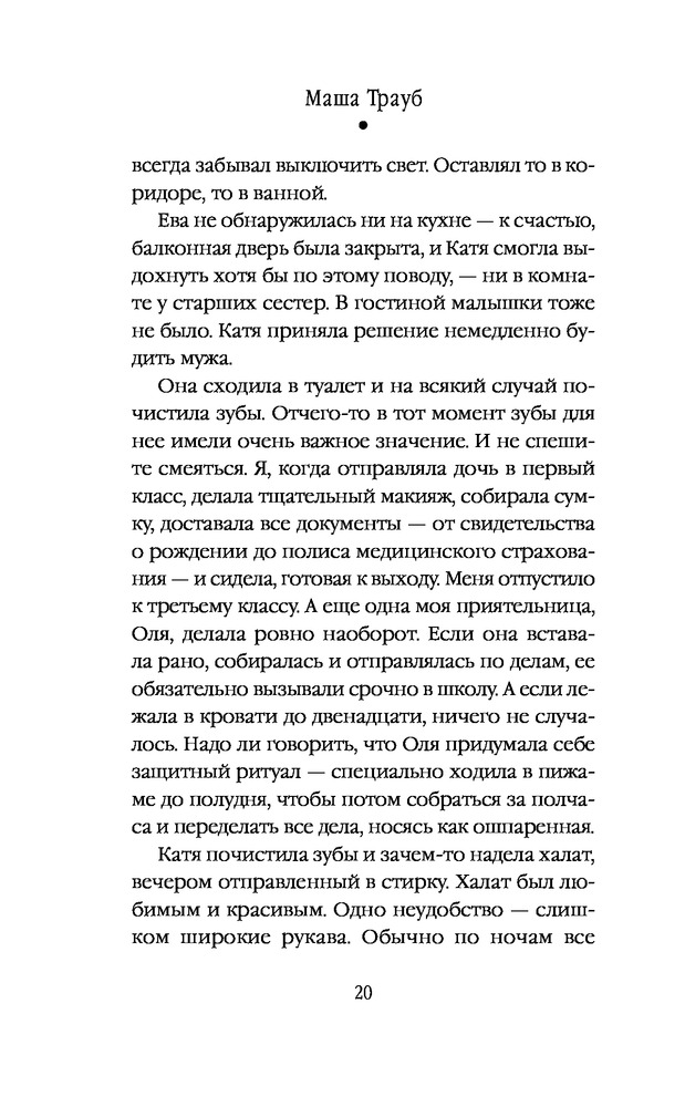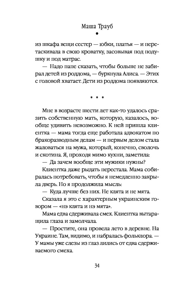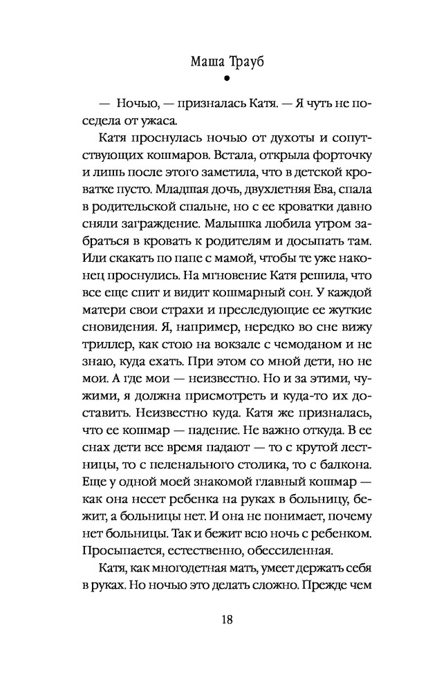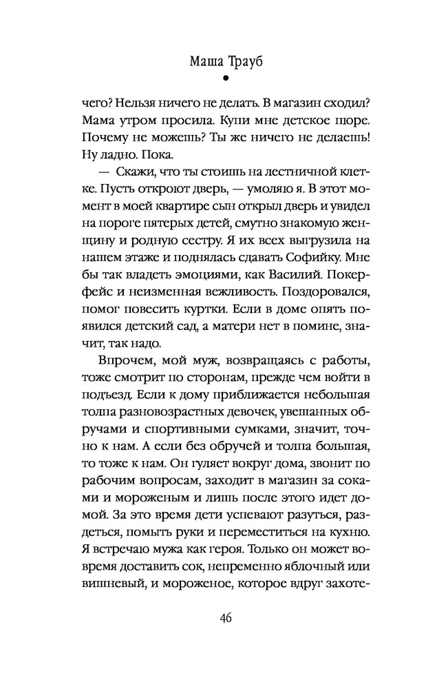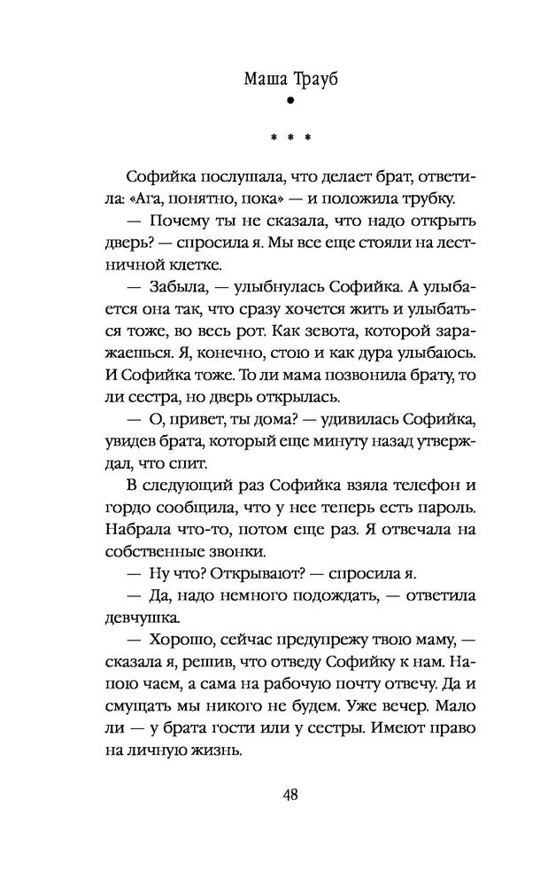 Серия: Проза Маши Трауб. Жизнь как в зеркале Эта книга сложилась из тех самых пресловутых пометок в блокноте, о которых так часто спрашивают читатели. Пометки я делаю редко, потому что все равно забываю, куда записала. Даже этот блокнот сохранила лишь по той причине, что в нем рисовала двухлетняя малышка, дочь моей подруги, а ее сестра-первоклассница придумывала собственный шрифт. В этом же блокноте я писала для нее смешные рифмы и объясняла разницу между твердым и мягким знаками, которые первоклашке казались одинаковыми. |