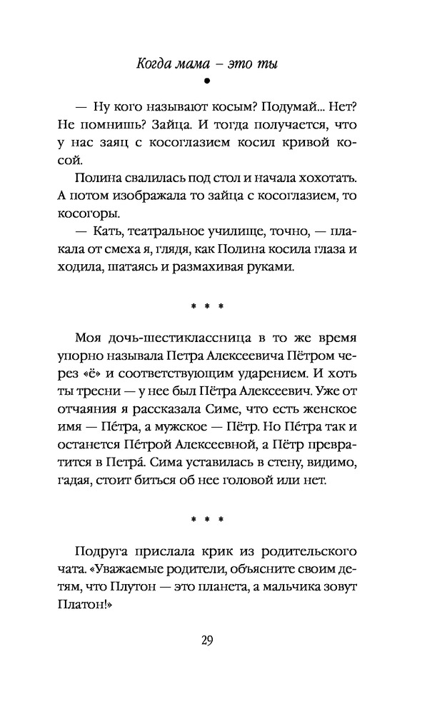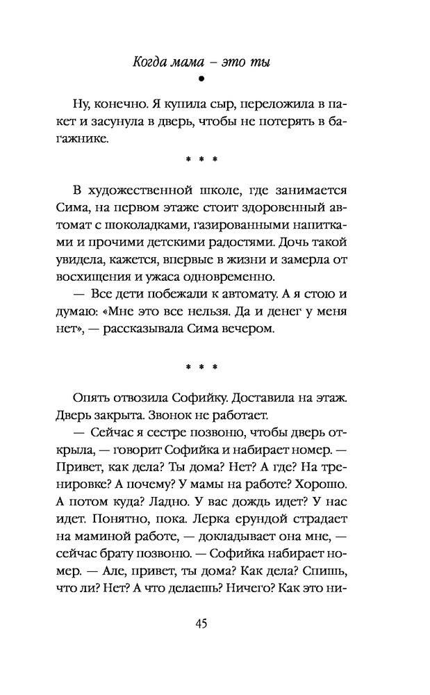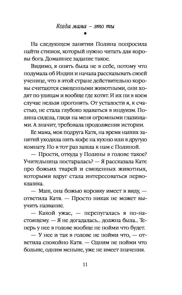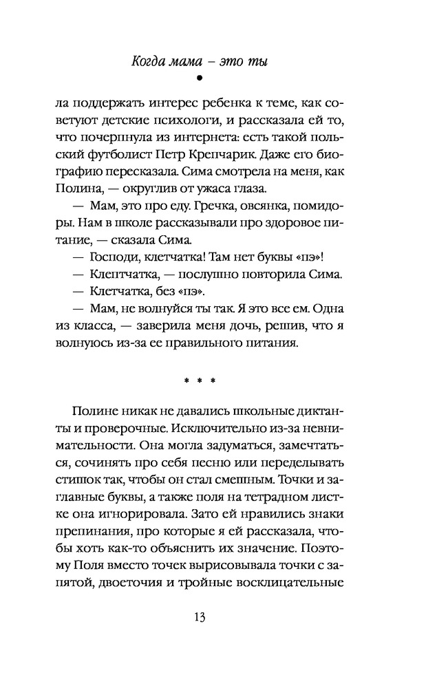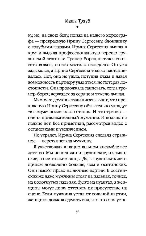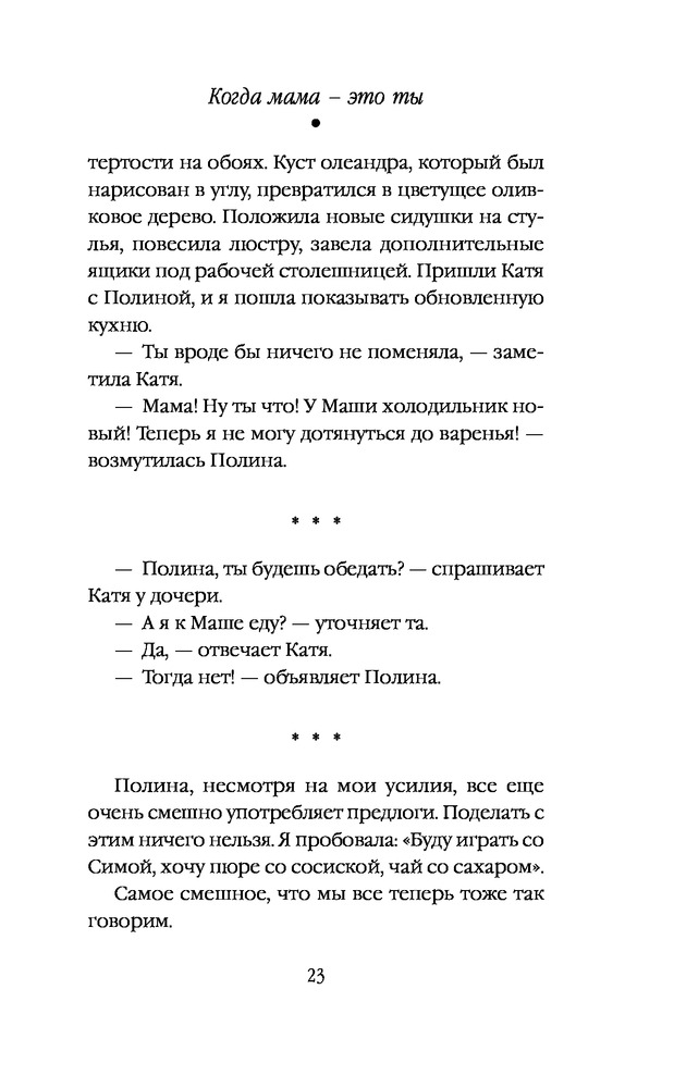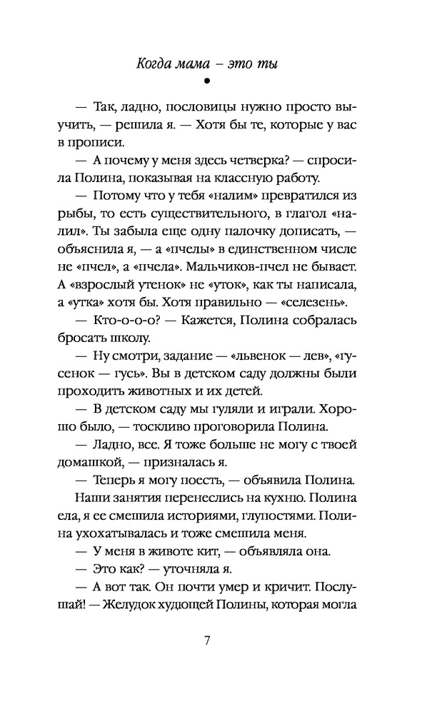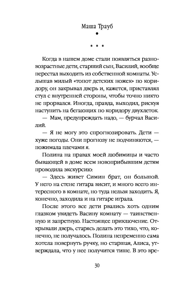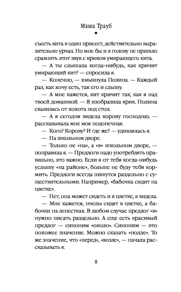 Серия: Проза Маши Трауб. Жизнь как в зеркале Эта книга сложилась из тех самых пресловутых пометок в блокноте, о которых так часто спрашивают читатели. Пометки я делаю редко, потому что все равно забываю, куда записала. Даже этот блокнот сохранила лишь по той причине, что в нем рисовала двухлетняя малышка, дочь моей подруги, а ее сестра-первоклассница придумывала собственный шрифт. В этом же блокноте я писала для нее смешные рифмы и объясняла разницу между твердым и мягким знаками, которые первоклашке казались одинаковыми. |