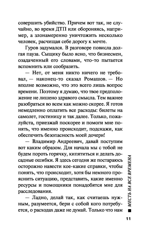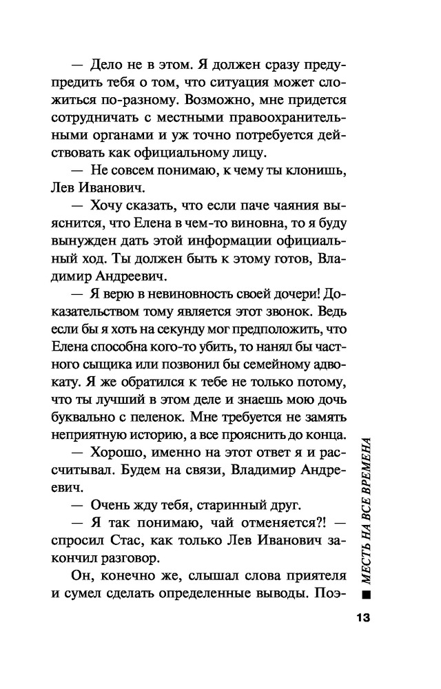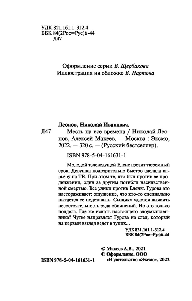 Месть на все временаАлексей Викторович Макеев, Николай Иванович Леонов В данный момент этот товар отсутствует в продаже. Возможно, у нас найдется аналогичный или похожий товар здесь. Серия: Русский бестселлер (обложка) Еще одна книга легендарного тандема Леонов-Макеев. Молодой телеведущей Елене грозит тюремный срок. Девушка подозрительно быстро сделала карьеру на ТВ. При этом те, кто был против ее продвижения, один за другим погибли насильственной смертью. Все улики против Елены. Гурова это настораживает: ощущение, что кто-то специально пытается ее подставить. Сыщику удается выявить несостоятельность ряда обвинений. Но это только полдела. Где же искать настоящего злоумышленника? Чутье направляет Гурова на след, который, на первый взгляд, ведет в тупик... Николай Леонов, в прошлом следователь МУРа, не понаслышке знал, как раскрываются самые запутанные уголовные дела. Поэтому каждая его книга — это правдивая захватывающая история с непредсказуемой интригой и неожиданным финалом. Главный герой этих книг, полковник Лев Гуров — сыщик высокого класса, к тому же с массой положительных человеческих качеств. Его уважают друзья, боятся враги и любят женщины. Он — настоящий отечественный супермен. Романы о Льве Гурове вот уже сорок лет неизменно привлекают поклонников отечественного детектива. Ставшая классической серия «Черная кошка» насчитывает более 200 книг, вышедших тиражом в десятки миллионов экземпляров. |