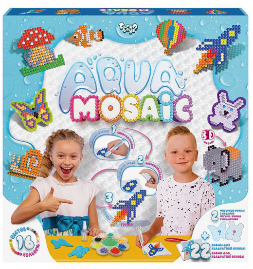 Креативное творчество «Aqua Mosaic», создайте красивые 3D рисунки из ярких разноцветных шаров. Эти шарики имеют специальный клеевой слой. Достаточно сбрызнуть выложенный рисунок водой и подождать до полного высыхания. Такая игра развивает мелкую моторику и сенсорику, способствует общему развитию ребенка.