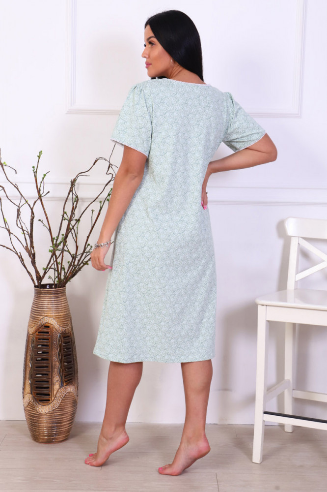 Обычная сорочка с миленьким узорчиком.Единственное, на фото: на девушке она длиной ниже колена, у меня, видимо, рост другой -не совпала с фото.На этикетке указан только размер.