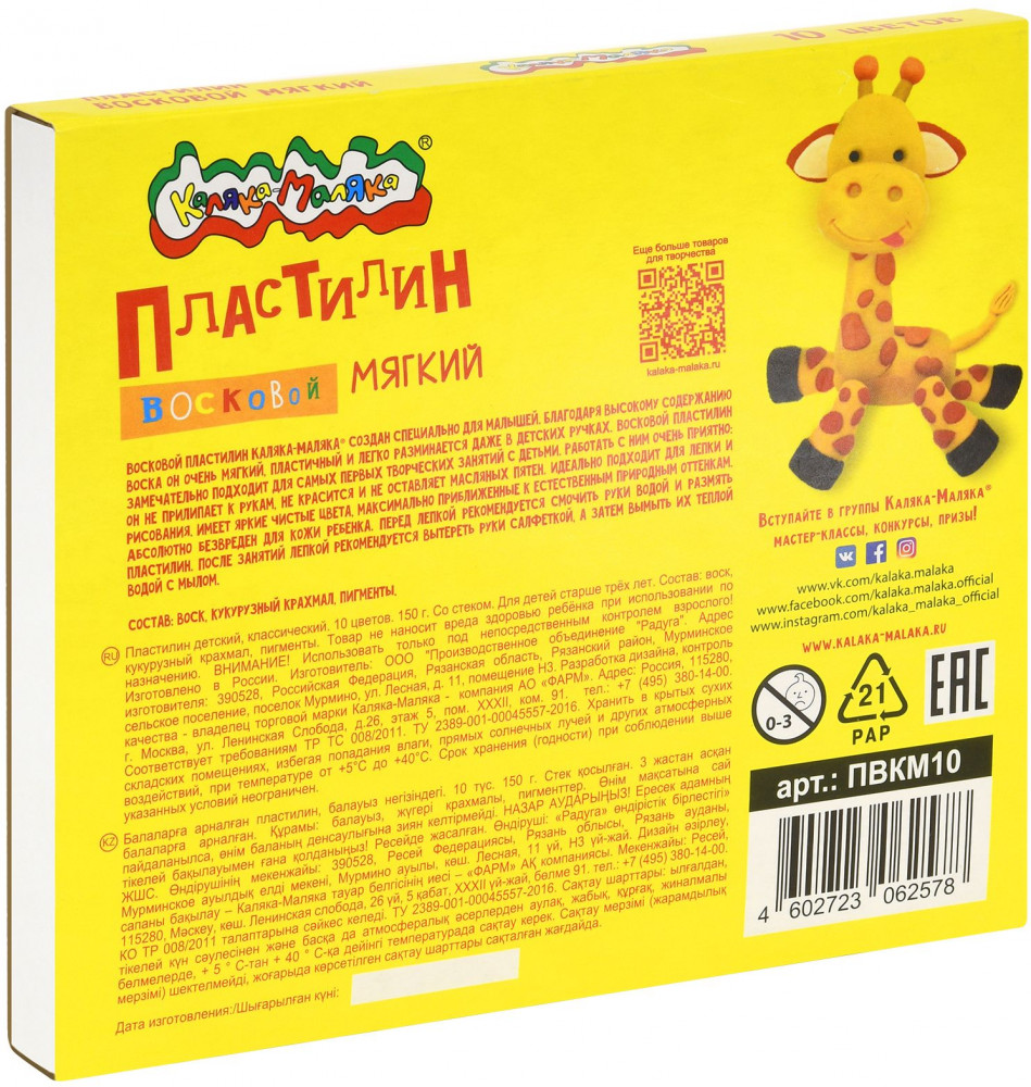 Каляка-Маляка Пластилин восковой со стекомВ данный момент этот товар отсутствует в продаже. Возможно, у нас найдется аналогичный или похожий товар здесь. Пластилин восковой Каляка-Маляка обладает повышенной мягкостью. Благодаря высокому содержанию воска, даже самые маленькие любители творчества без труда смогут смять брусок и придать ему нужную форму. Имеет яркие цвета, мягко растягивается и не рвется, прекрасно держит форму. При этом не окрашивает руки, не прилипает и не оставляет масляных пятен. В набор входит стек. Изготавливается на современном российском производстве, соответствует всем стандартам безопасности детской продукции. |