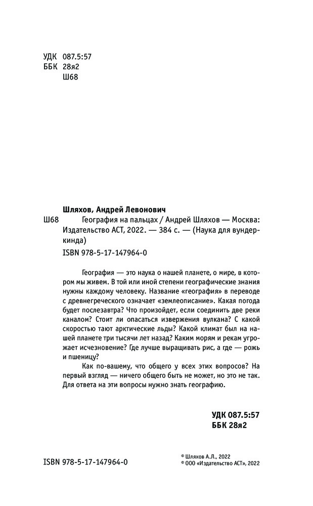 География на пальцахВ данный момент этот товар отсутствует в продаже. Возможно, у нас найдется аналогичный или похожий товар здесь. Серия: Наука для вундеркинда География — это наука о нашей планете, о мире, в котором мы живем. В той или иной степени географические знания нужны каждому человеку. Название «география» в переводе с древнегреческого означает «землеописание». Какая погода будет послезавтра? Что произойдет, если соединить две реки каналом? Стоит ли опасаться извержения вулкана? С какой скоростью тают арктические льды? Какой климат был на на- шей планете три тысячи лет назад? Каким морям и рекам угрожает исчезновение? Где лучше выращивать рис, а где — рожь и пшеницу? Как по-вашему, что общего у всех этих вопросов? На первый взгляд — ничего общего быть не может, но это не так. Для ответа на эти вопросы нужно знать географию. |