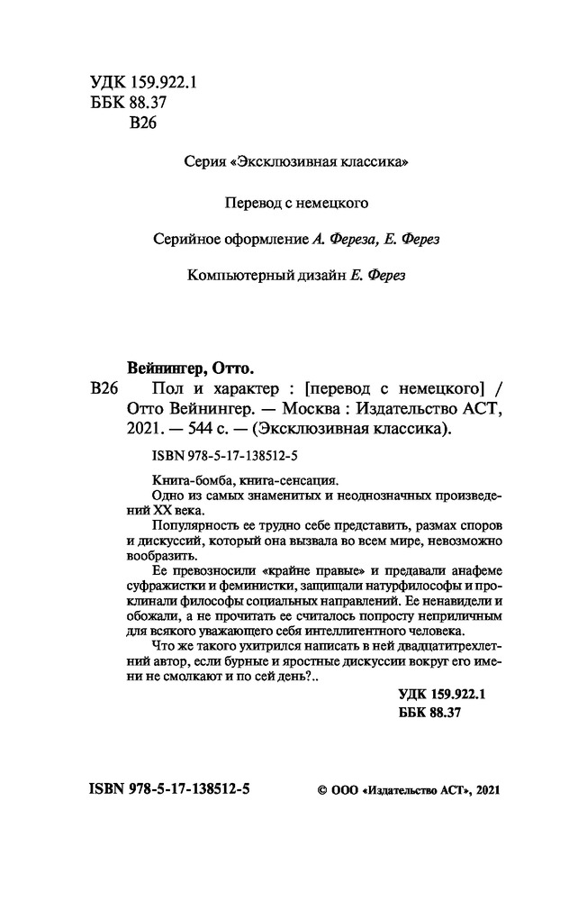 💳 Оплатить за товар можно при получении 🇰🇿 Есть бесплатная доставка по Казахстану от 1 дня 🎁 Копите бонусы с каждой покупки Серия: Эксклюзивная классика Книга-бомба, книга-сенсация.Одно из самых знаменитых и неоднозначных произведений ХХ века.Популярность ее трудно себе представить, размах споров и дискуссий, который она вызвала во всем мире, невозможно вообразить.Ее превозносили «крайне правые» и предавали анафеме суфражистки и феминистки, защищали натурфилософы и проклинали философы социальных направлений. Ее ненавидели и обожали, а не прочитать ее считалось попросту неприличным для всякого уважающего себя интеллигентного человека.Что же такого ухитрился написать в ней двадцатитрехлетний автор, если бурные и яростные дискуссии вокруг его имени не смолкают и по сей день?.. |