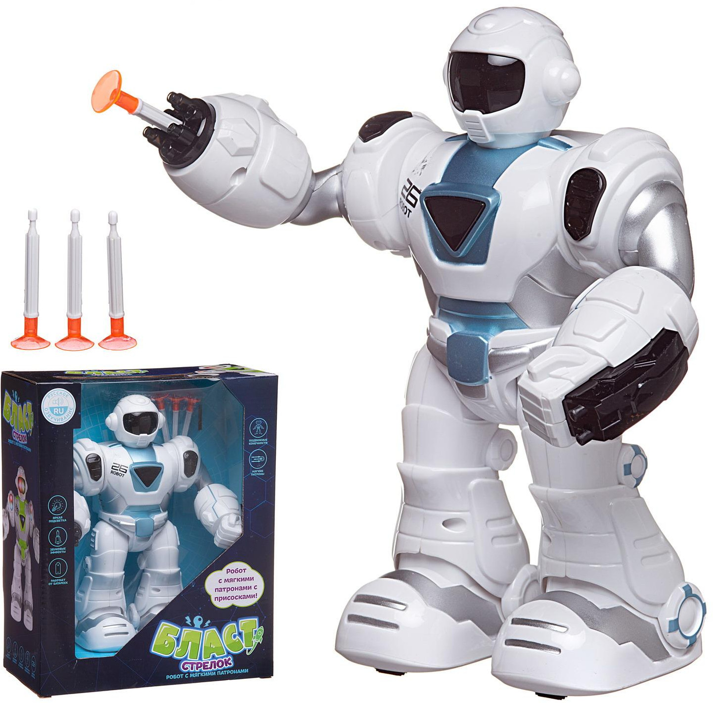 Junfa Toys Робот «Стрелок»В данный момент этот товар отсутствует в продаже. Возможно, у нас найдется аналогичный или похожий товар здесь. Серия: Бласт Робот «Стрелок» из серии «Бласт» станет отличным подарком для любого мальчика. Он имеет реалистичный дизайн, яркую подсветку. Робот умеет ходить, его руки и ноги подвижны. В правую руку робота встроена пусковая установка, которая стреляет безопасными стрелами с наконечниками в виде присосок, входящими в комплект набора. Чтобы запустить стрелу, нужно нажать на кнопку на правой руке. Робот произносит фразы на русском языке. |