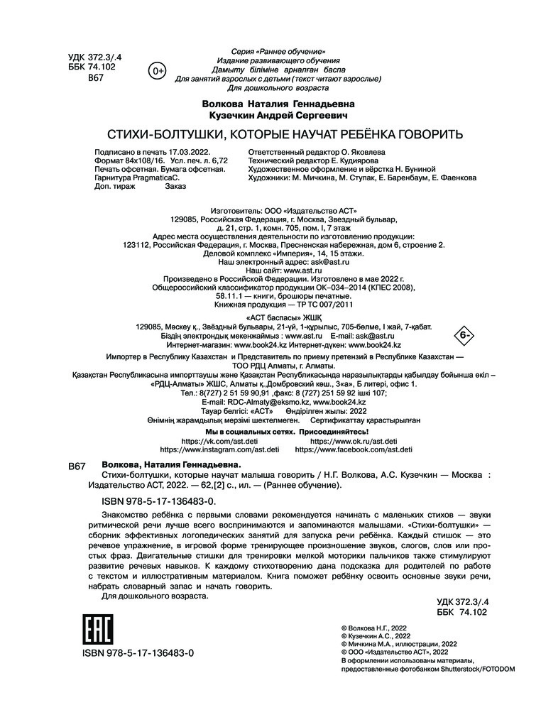 Стихи-болтушки, которые научат малыша говоритьНаталия Геннадьевна Волкова, Андрей Сергеевич Кузечкин +105 красочные иллюстрации пояснения родителям разнообразные стихи подходит малышам тонкие страницы