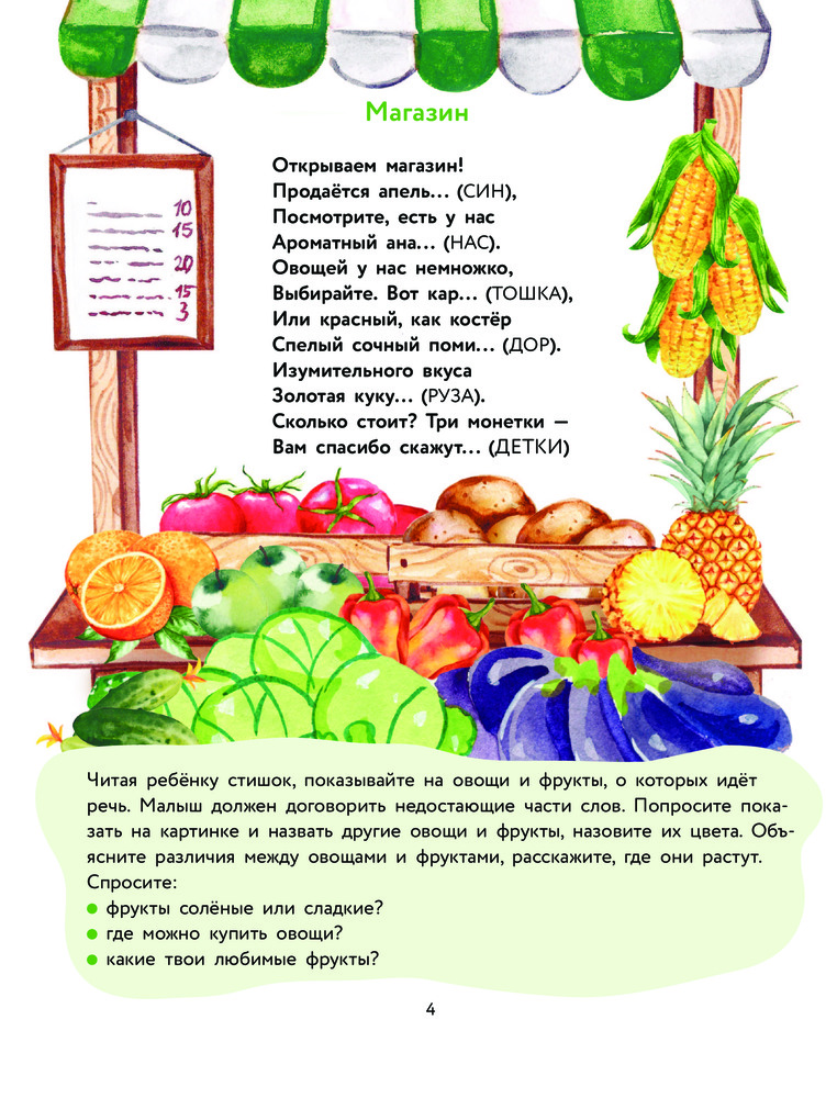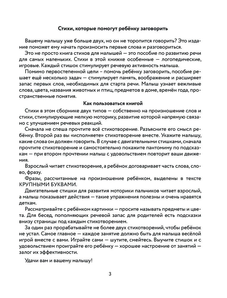 Книга замечательная, есть пояснения для родителей как правильно заниматься с ребенком. Есть красивые красочные крупные картинки для детей И причем есть просто стихотворения для заучивания, есть стишки для договаривания слов. А так же есть стихи для связки с движениями. Книга супер, 100% рекомендую к покупке для малыше. Сыну 1,5 года с удовольствием читаем и смотрим картинки каждый день
