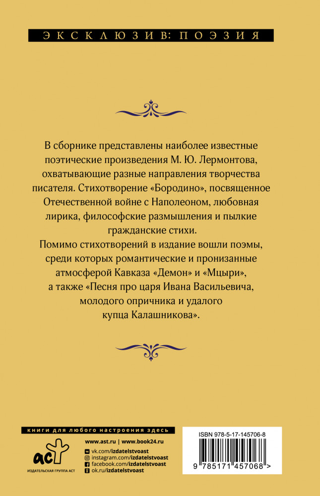 💳 Оплатить за товар можно при получении 🇰🇿 Есть бесплатная доставка по Казахстану от 1 дня 🎁 Копите бонусы с каждой покупки Серия: Эксклюзив: поэзия В сборнике представлены наиболее известные поэтические произведения М.Ю. Лермонтова, охватывающие разные направления творчества писателя. Стихотворение «Бородино», посвященное Отечественной войне с Наполеоном, любовная лирика, философские размышления и пылкие гражданские стихи. |