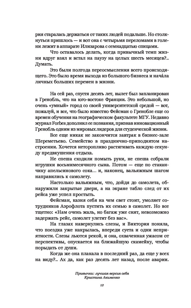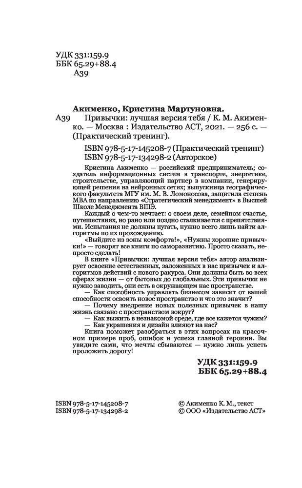 💳 Оплатить за товар можно при получении 🇰🇿 Есть бесплатная доставка по Казахстану от 1 дня 🎁 Копите бонусы с каждой покупки Серия: Практический тренинг Кристина Акименко — российский предприниматель; создатель информационных систем в транспорте, энергетике, строительстве, управляющий партнер в компании, генерирующей решения на нейронных сетях; выпускница географического факультета МГУ им. М. В. Ломоносова, защитила степень MBA по направлению «Стратегический менеджмент» в Высшей Школе Менеджмента ВШЭ. Каждый о чем-то мечтает: о своем деле, семейном счастье, путешествиях, но рано или поздно сталкивается с препятствиями. Испытания не должны пугать, нужно всего лишь найти алгоритмы по их прохождению. «Выйдите из зоны комфорта!», «Нужны хорошие привычки!» — говорят все книги по саморазвитию. Просто сказать, непросто сделать! В книге «Привычки: лучшая версия тебя» автор анализирует освоение естественных, заложенных в нас привычек и алгоритмов действий с нового ракурса. Они должны быть во всех сферах жизни — от бытовых до глобальных. Эти привычки не нужно заводить, они есть в окружающем нас пространстве. — Как способность управлять бизнесом зависит от вашей способности освоить новое пространство и что это значит? — Почему внедрение новых полезных привычек в нашу жизнь связано с пространством вокруг? — Как выжить в незнакомой среде, где все кажется чужим? — Как украшения и дизайн влияют на нас? Книга поможет разобраться в этих вопросах на красочном примере проб, ошибок и успеха главной героини. Вы увидите сами, что мечты сбываются — нужно лишь успеть проложить дорогу! |