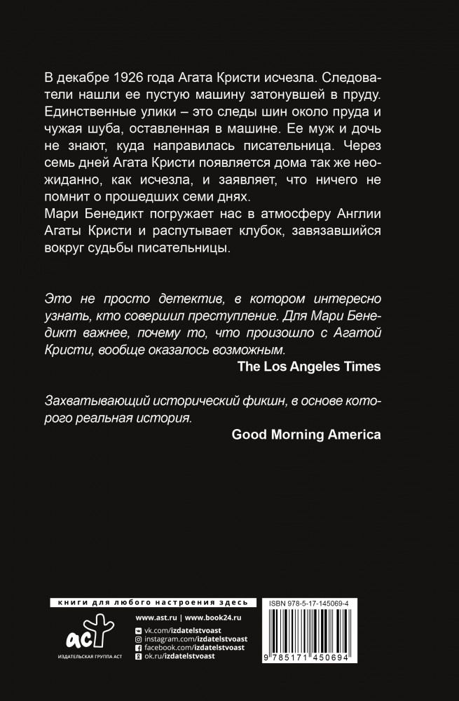 💳 Оплатить за товар можно при получении 🇰🇿 Есть бесплатная доставка по Казахстану 🎁 Копите бонусы с каждой покупки Серия: Легендарные имена В декабре 1926 Агата Кристи исчезла. Следователи находят ее пустую машину затонувшей в пруду. Единственные улики — это следы шин около пруда и чужая шуба, оставленная в машине. Поиски не дают результатов, но через семь дней Агата Кристи появляется дома так же неожиданно, как исчезла. Писательница заявляет, что ничего не помнит о прошедших семи днях. |