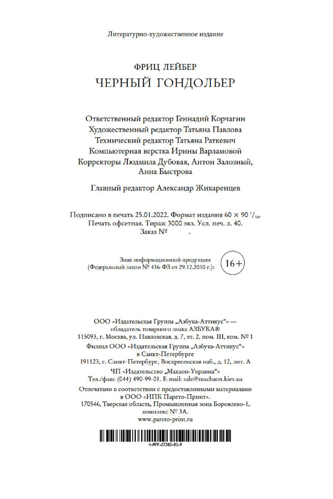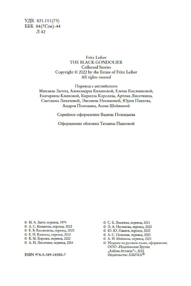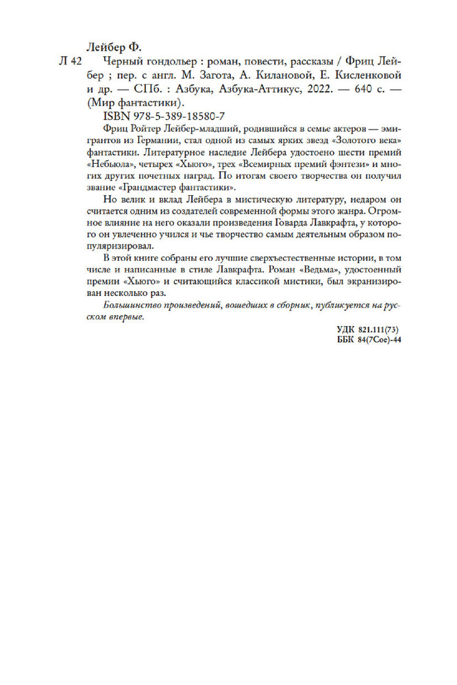 Но велик и вклад Лейбера в мистическую литературу, недаром он считается одним из создателей современной формы этого жанра. Огромное влияние на него оказали произведения Говарда Лавкрафта, у которого он увлеченно учился и чье творчество самым деятельным образом популяризовал. В этой книге собраны его лучшие сверхъестественные истории, в том числе и написанные в стиле Лавкрафта. Роман «Ведьма», удостоенный премии «Хьюго» и считающийся классикой мистики, был экранизирован несколько раз. Большинство произведений, вошедших в сборник, публикуется на русском впервые. |