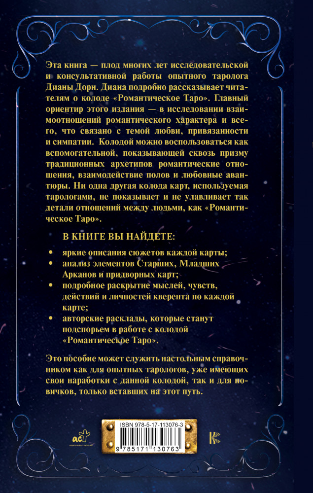 💳 Оплатить за товар можно при получении 🇰🇿 Есть бесплатная доставка по Казахстану 🎁 Копите бонусы с каждой покупки Серия: Тайные знания от А до Я Эта книга — плод многих лет исследовательской и консультативной работы опытного таролога Дианы Дорн. Диана подробно рассказывает читателям о колоде «Романтическое Таро». |
