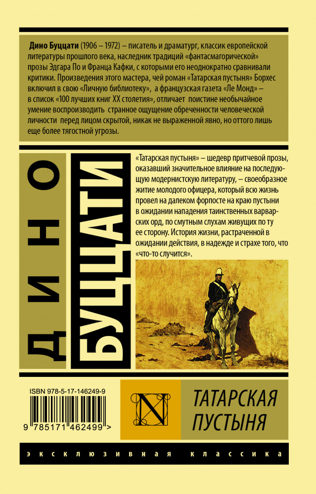 Татарская пустыняВ данный момент этот товар отсутствует в продаже. Возможно, у нас найдется аналогичный или похожий товар здесь. Серия: Эксклюзивная классика «Татарская пустыня» — шедевр притчевой прозы, оказавший значительное влияние на последующую модернистскую литературу, — своеобразное житие молодого офицера, который всю жизнь провел на далеком форпосте на краю пустыни в ожидании нападения таинственных варварских орд, по смутным слухам живущих по ту ее сторону. История жизни, растраченной в ожидании действия, в надежде и страхе того, что «что-то случится». |