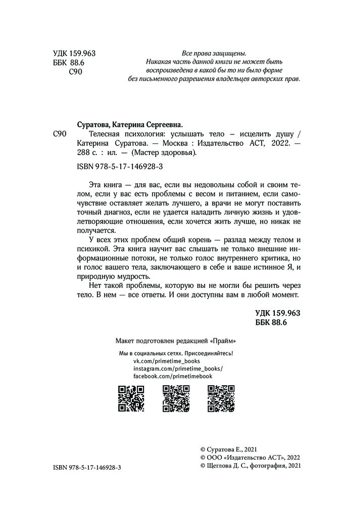 💳 Оплатить за товар можно при получении 🇰🇿 Есть бесплатная доставка по Казахстану от 1 дня 🎁 Копите бонусы с каждой покупки Серия: Мастер здоровья Эта книга — для вас, если вы недовольны собой и своим телом, если у вас есть проблемы с весом и питанием, если самочувствие оставляет желать лучшего, а врачи не могут поставить точный диагноз, если не удается наладить личную жизнь и удовлетворяющие отношения, если хочется жить лучше, но никак не получается. У всех этих проблем общий корень — разлад между телом и психикой. |