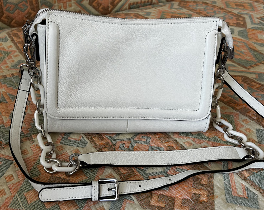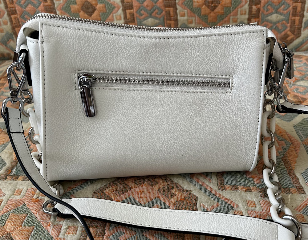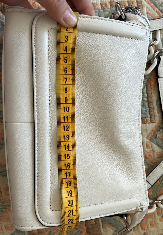 Сумка потрясающая..размер идеальный,средний…цвет белоснежный,кожа мягкая…два ремешка,длинный регулируется,короткий удобен и для плеча и для руки..внутри кармашки,два на замочках.размеры на фото.очень красивая,стильная сумочка,я в восторге 🤗