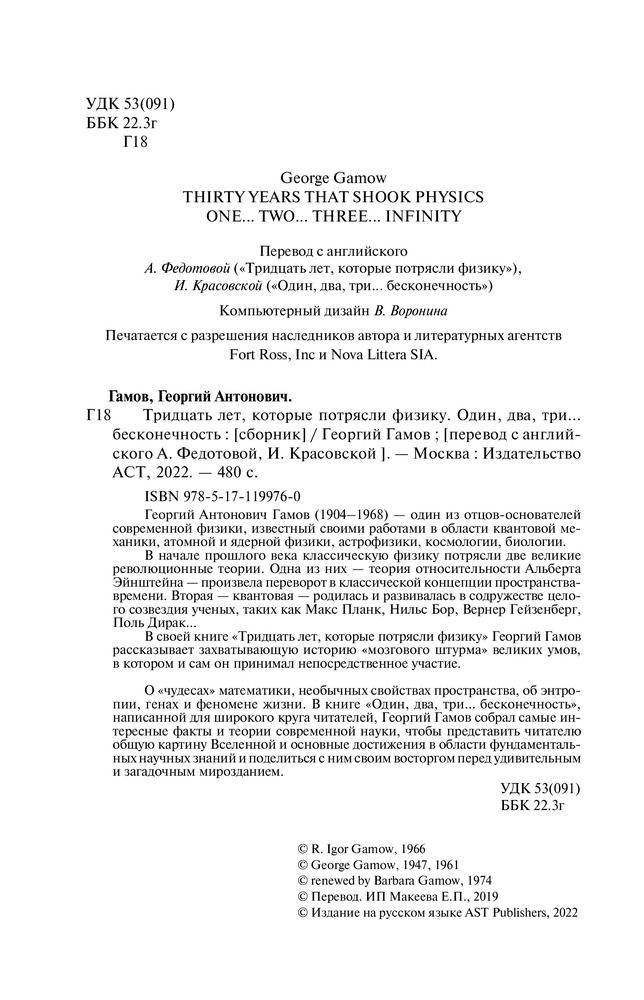 Тридцать лет, которые потрясли физику. Один, два, три... бесконечностьВ данный момент этот товар отсутствует в продаже. Возможно, у нас найдется аналогичный или похожий товар здесь. Серия: Фейнмановские лекции по физике Георгий Антонович Гамов (1904–1968) — один из отцов-основателей современной физики, известный своими работами в области квантовой механики, атомной и ядерной физики, астрофизики, космологии, биологии. В начале прошлого века классическую физику потрясли две великие революционные теории. |