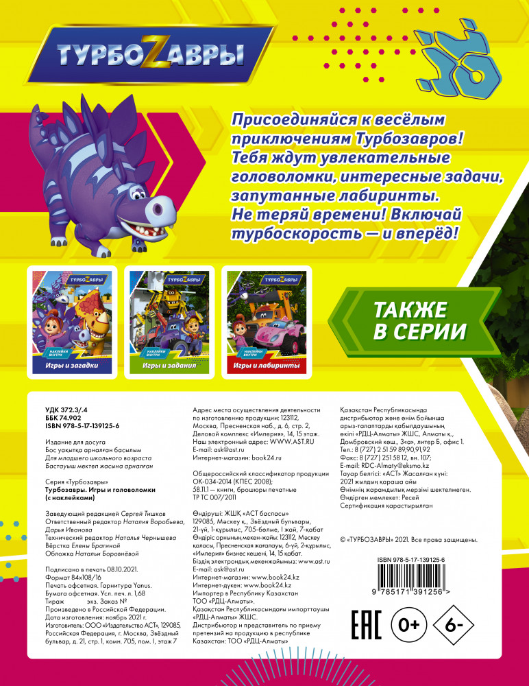 💳 Оплатить за товар можно при получении 🇰🇿 Есть бесплатная доставка по Казахстану от 1 дня 🎁 Копите бонусы с каждой покупки Серия: Турбозавры Присоединяйся к весёлым приключениям Турбозавров! Тебя ждут увлекательные головоломки, интересные задачи, запутанные лабиринты. Не теряй времени! Включай турбоскорость — и вперёд! |