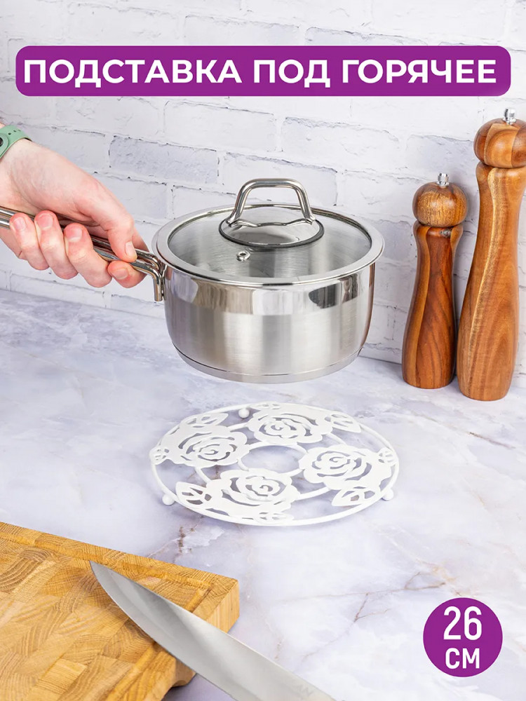 El Casa Подставка под горячееВ данный момент этот товар отсутствует в продаже. Возможно, у нас найдется аналогичный или похожий товар здесь. Подставка под горячее убережет поверхность стола от горячих предметов и сможет стать настоящим украшением кухни. Подставка выполнена из высококачественного металла и украшена узорами роз. Надежно стоит на закругленных ножках: не будет царапать поверхность. Подставка под горячее станет удобным помощником в сервировке стола и подаче самых разных блюд. |