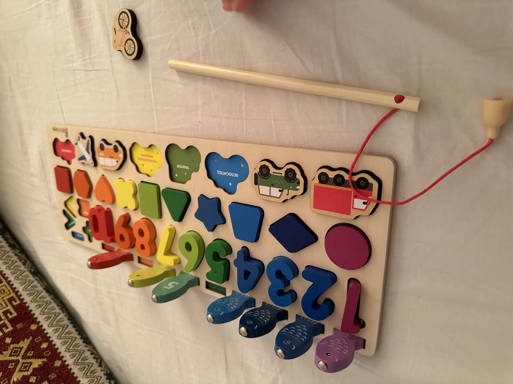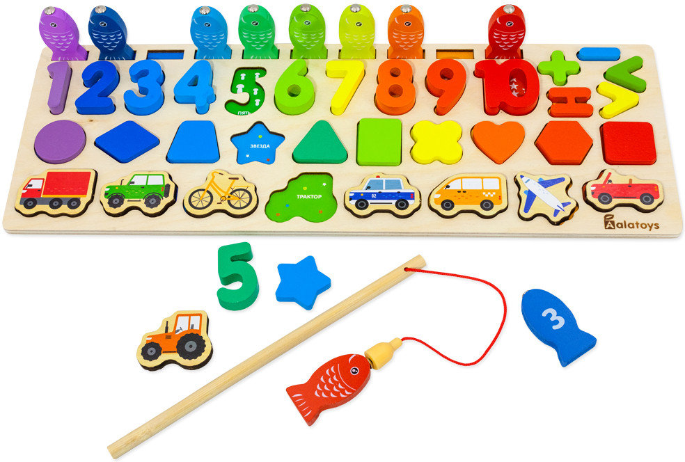 Это просто замечательный сортер для ребенка! Купила в подарок племяннику (2 года), ребенка после этого не было слышно около часа. Качество очень хорошее, рыбки и цифры яркие, цвета приятные. Магнит держит хорошо, сама "рыбачила" из любопытства. Параллельно ребенка можно учить цифрам, цветам, названиям транспорта и фигур, потому что все подписано. Также можно будет заниматься простой арифметикой. Однозначно советую к покупке, если ребенку интересны такого рода игрушки и занятия.