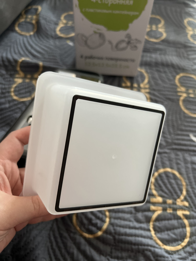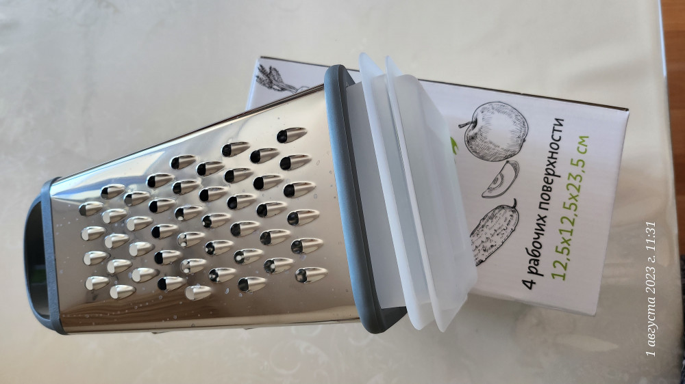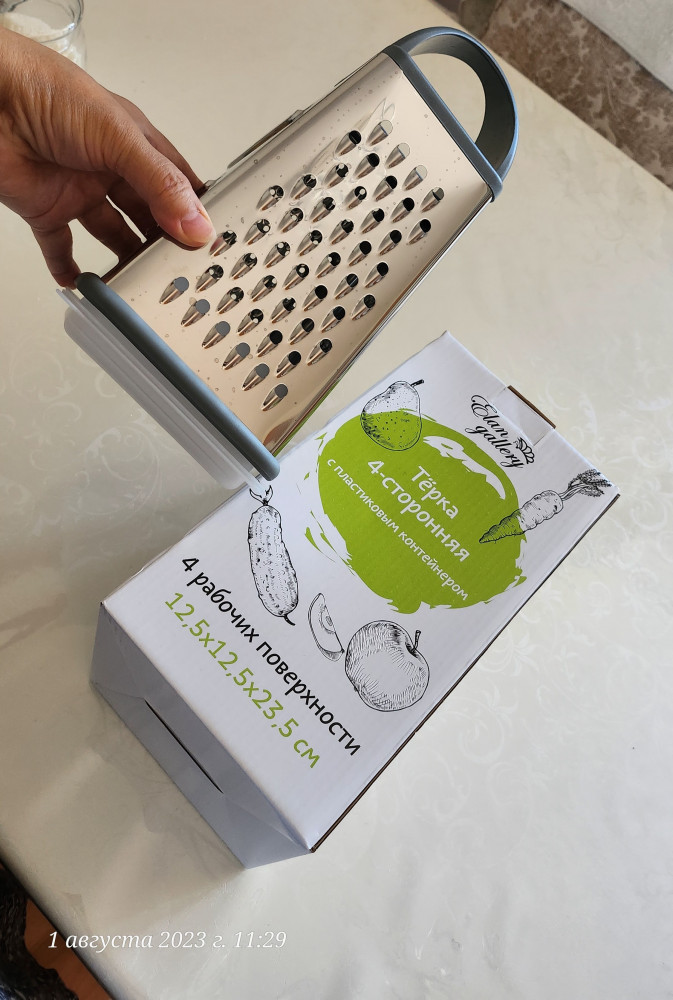 Скажу честно, ещё даже на опробовала в работе. Впервые в жизни я впечатлена теркой 😂 Поэтому побежала сразу оставлять отзыв. Терка из довольно плотного материала (нерж сталь 0.25), блестящая 😍. Ручка сидит крепко и надежно. Контейнер небольшой, подойдёт натереть овощи для зажарки, или сыра. Прорезиненное основание как у самой тёрки, так и у контейнера. В общем не только необходимая вещь, но и аксессуар)