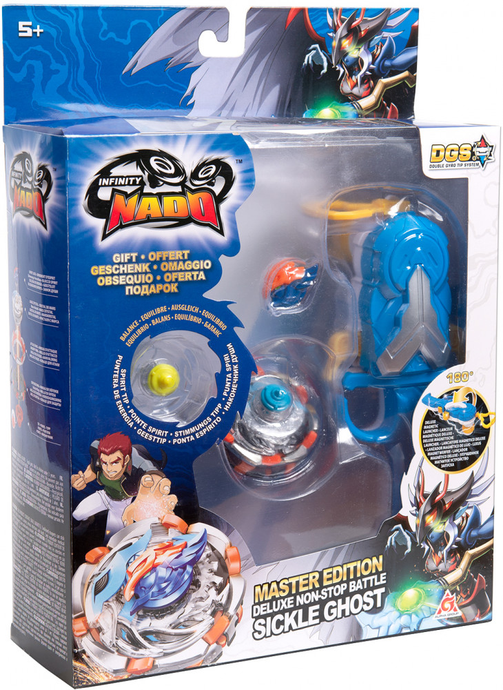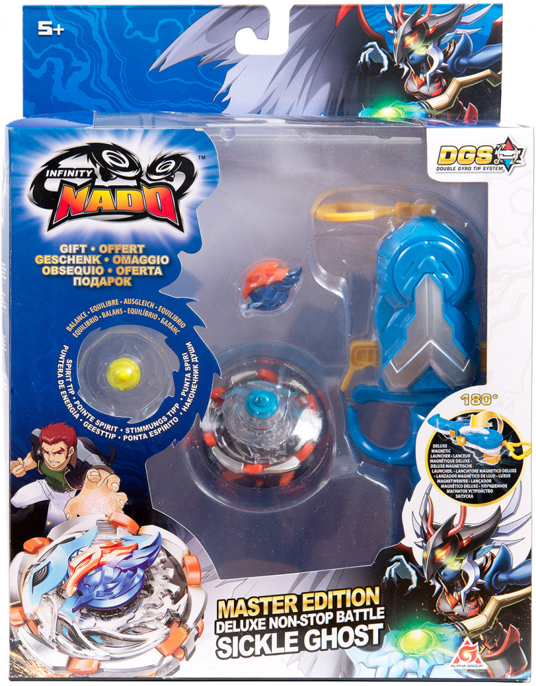 Волчок Infinity Nado линейки Мастер состоит из 5 основных частей: аватара Надо, кристалла, атакующего кольца, защитного кольца и наконечника. Эти элементы являются взаимозаменяемыми со всеми волчками серий Классик, Ориджинал, Адвансд и Алтимейт.