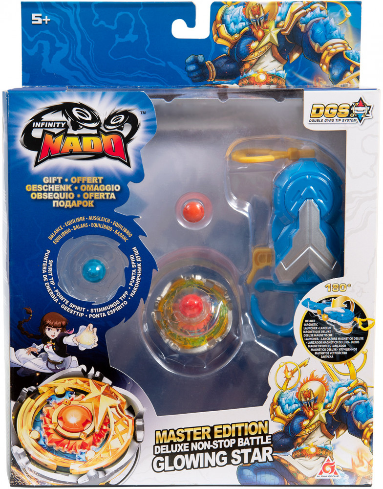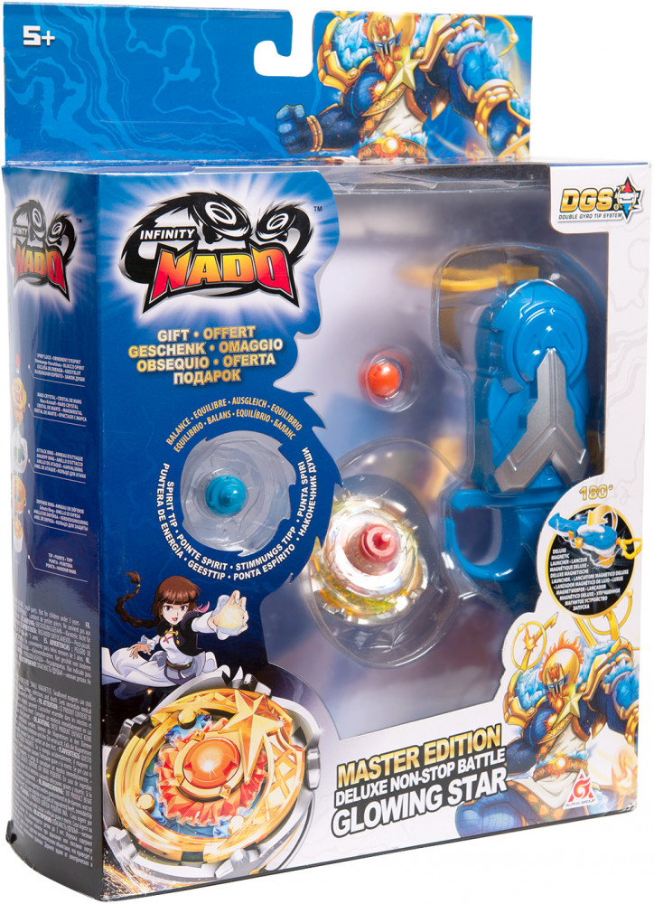 Волчок Infinity Nado линейки Мастер состоит из 5 основных частей: аватара Надо, кристалла, атакующего кольца, защитного кольца и наконечника. Эти элементы являются взаимозаменяемыми со всеми волчками серий Классик, Ориджинал, Адвансд и Алтимейт.