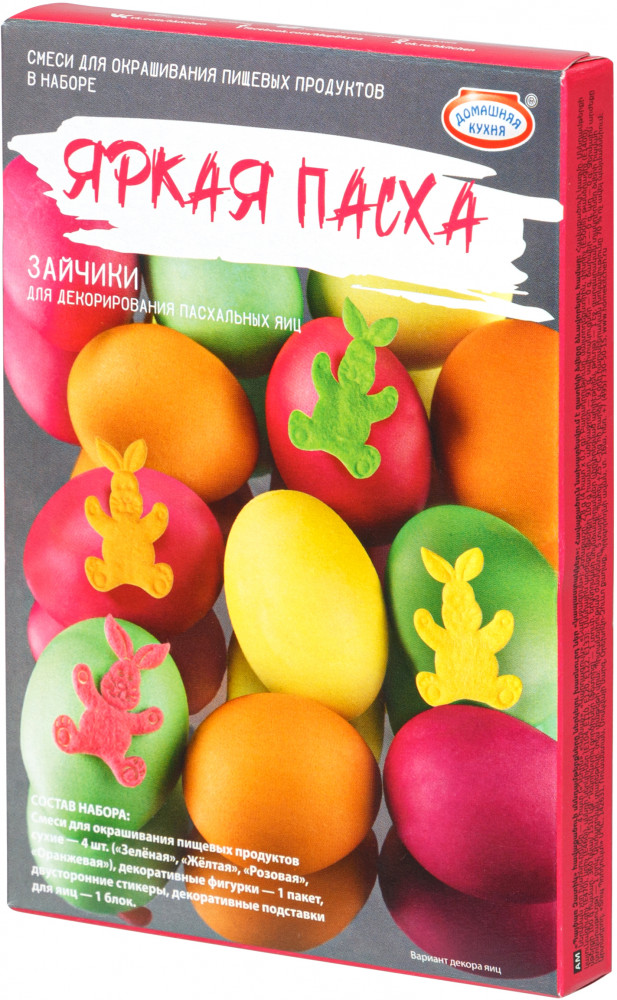Смеси для окрашивания пищевых продуктов «Зверушки» в наборе «Яркая Пасха» марки «Домашняя кухня» помогут украсить стол к празднику. При этом вы можете привлечь к творческому процессу всю семью! Все, что от вас потребуется, — это окрасить яйца в яркие неоновые цвета, а затем выбрать на них место для милых фетровых фигурок. Результат будет впечатляющим! Сделайте нарядную композицию вместе и и получите заряд хороших эмоций.