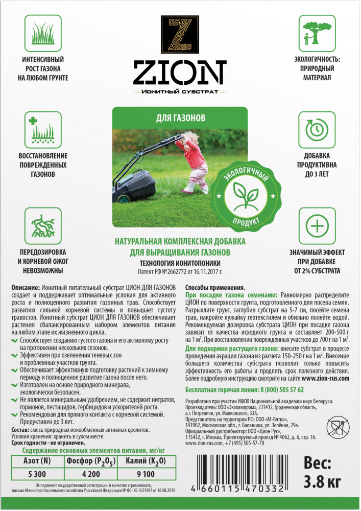 Ионитный питательный субстрат цион для газонов создает и поддерживает оптимальные условия для активного роста и полноценного развития газонных трав. Способствует развитию сильной корневой системы и повышает густоту травостоя. Ионитный субстрат цион для газонов обеспечивает растения сбалансированным набором элементов питания на любом этапе их жизненного цикла. Ионитный субстрат цион для газонов может быть использован для обеспечения растения сбалансированным набором элементов питания на любом этапе его жизненного цикла. В течение периода полезного действия циона никаких дополнительных подкормок растению не потребуется.