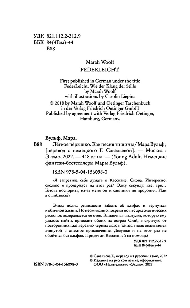 В данный момент этот товар отсутствует в продаже. Возможно, у нас найдется аналогичный или похожий товар здесь. Серия: Young Adult. Немецкие фэнтези-бестселлеры Мары Вульф «Я запретила себе думать о Кассиане. Снова. Интересно, сколько я продержусь на этот раз? Одну секунду, две, три… Готова поспорить, из-за меня он и слезинки не проронил. Или я ошибаюсь?»