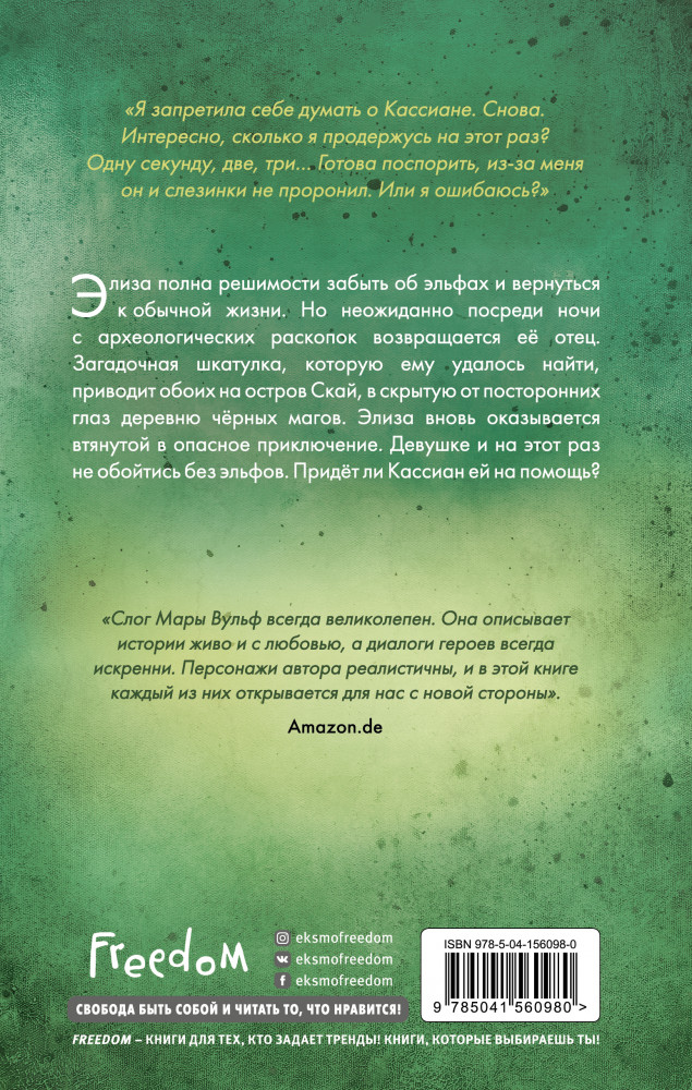 Элиза полна решимости забыть об эльфах и вернуться к обычной жизни. Но неожиданно посреди ночи с археологических раскопок возвращается ее отец. Загадочная шкатулка, которую ему удалось найти, приводит обоих на остров Скай, в скрытую от посторонних глаз деревню черных магов. Элиза вновь оказывается втянутой в опасное приключение. Девушке и на этот раз не обойтись без эльфов. Придет ли Кассиан ей на помощь?