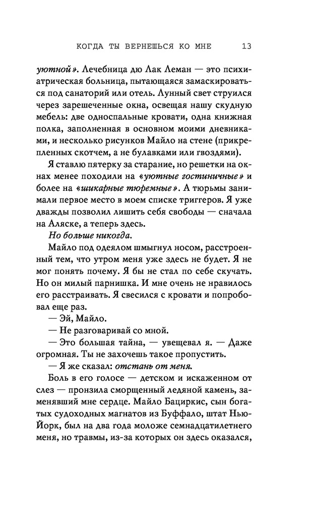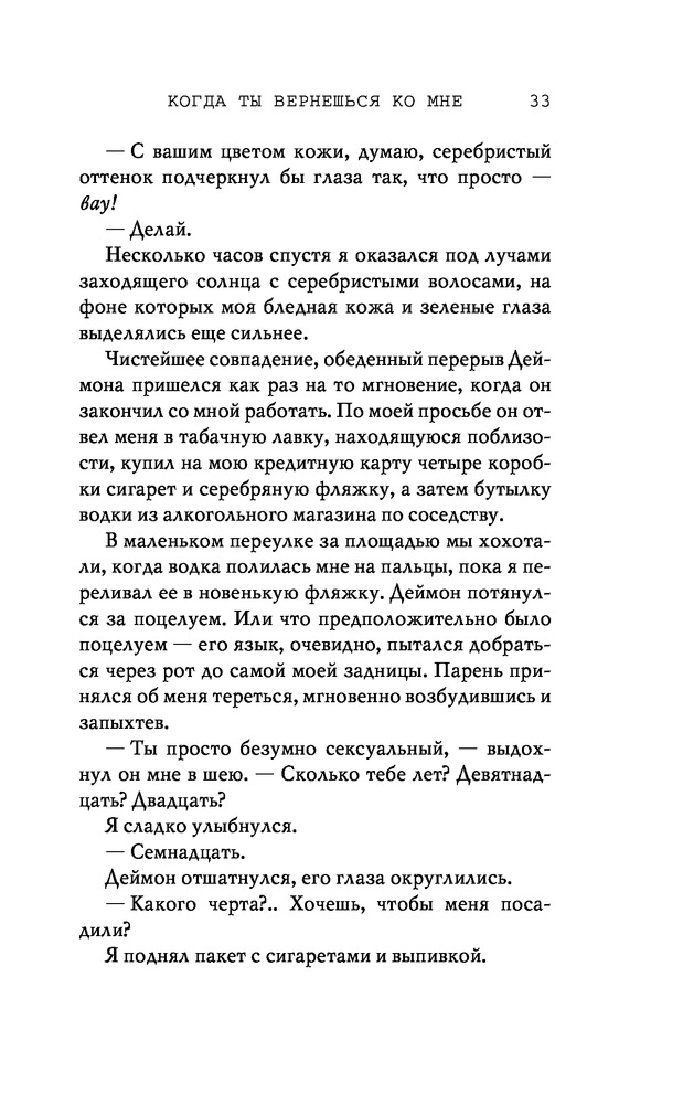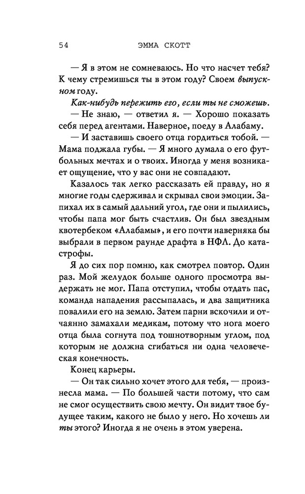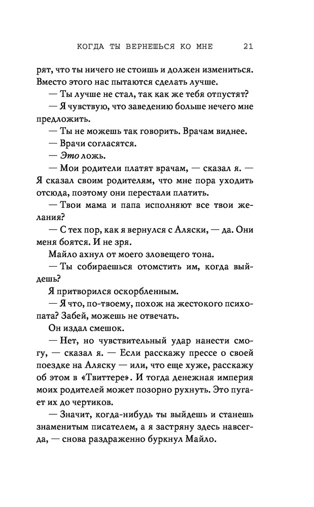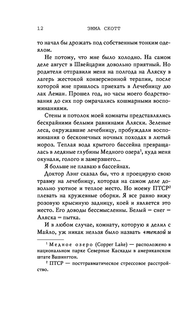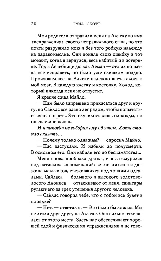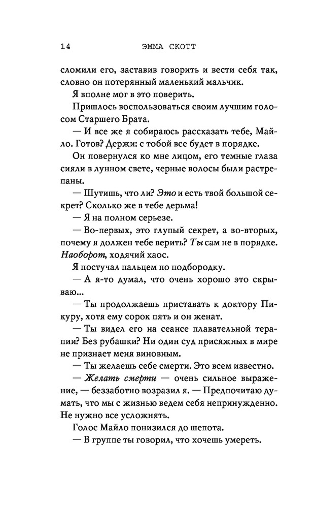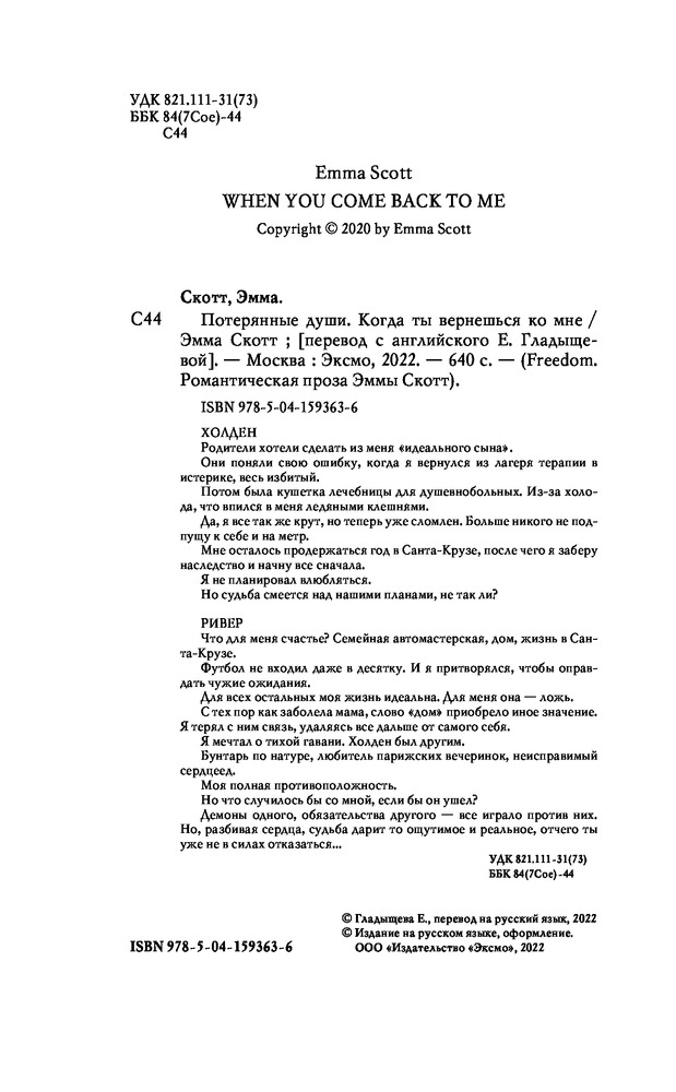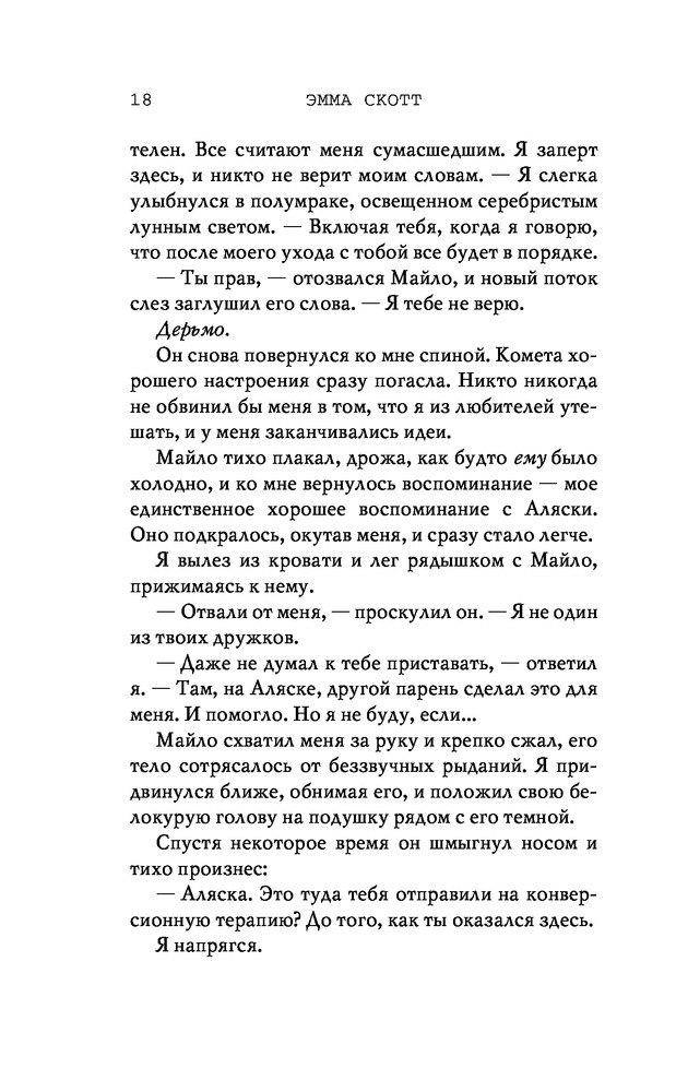Потерянные души. Когда ты вернешься ко мнеВ данный момент этот товар отсутствует в продаже. Возможно, у нас найдется аналогичный или похожий товар здесь. Серия: Freedom. Романтическая проза Эммы Скотт Родители хотели сделать из меня «идеального сына». Они поняли свою ошибку, когда я вернулся из лагеря терапии в истерике, весь избитый. Потом была кушетка лечебницы для душевнобольных. Из-за холода, что впился в меня ледяными клешнями. Да, я все так же крут, но теперь уже сломлен. Больше никого не подпущу к себе и на метр. Мне осталось продержаться год в Санта-Крузе, после чего я заберу наследство и начну все сначала. Я не планировал влюбляться. Но судьба смеется над нашими планами, не так ли? |