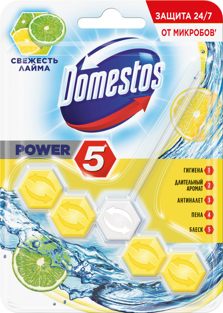 Domestos Сила 5 — пять действий, которые объединились в одном эффективном средстве для поддержания чистоты, блеска и приятного аромата в вашем туалете. Domestos Power 5 — это эффективное средство, которое содержит в себе не один, а целых пять преимуществ, обеспечивающих защиту от загрязнений, а значит и микробов. При использовании блоков Domestos Power 5 каждое смывание — заряд свежего аромата лаванды, который остается в течение длительного времени — до 4-х часов.