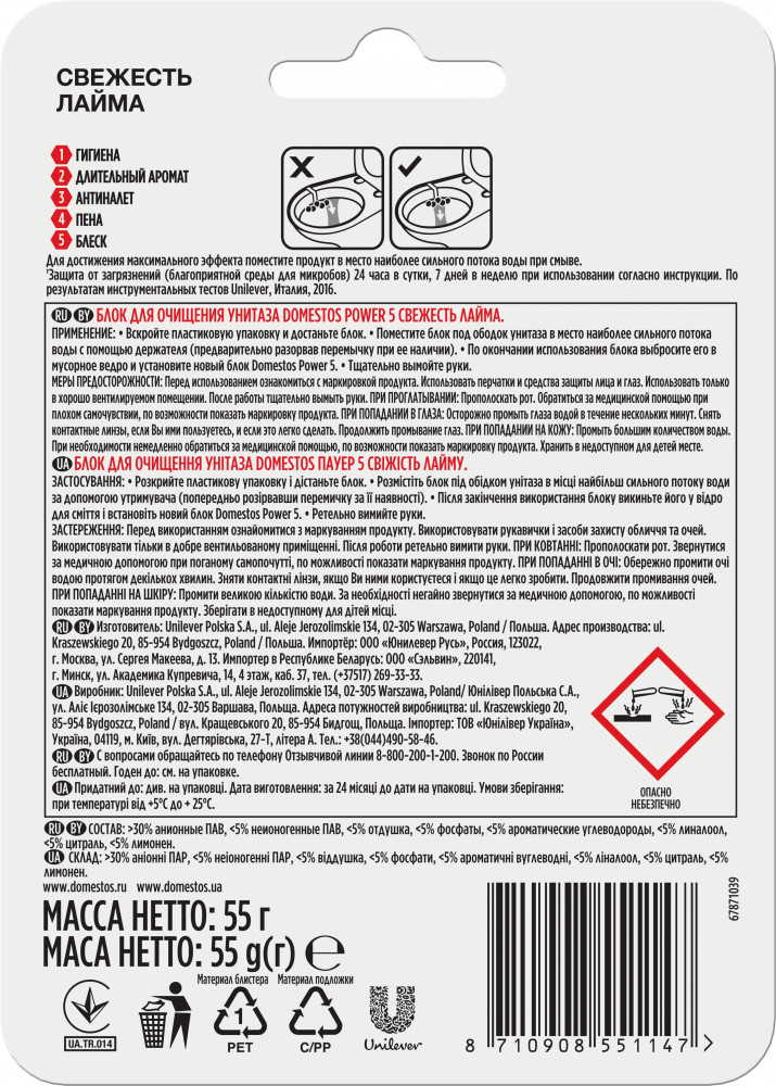 Больше никакого налета на внутренней поверхности унитаза — блок Domestos Power 5 успешно справляется с данной задачей. Смывание за смыванием блок оставляет обильную пену и аромат, борется с налетом, поддерживает чистоту, оставляя поверхность унитаза блестящей. С блоками Domestos Power 5 поддержание чистоты и свежести вашего туалета стало проще. Domestos Power 5 — на защите чистоты, гигиены, а значит и здоровья вашей семьи. Для достижения максимального эффекта поместите продукт в место наиболее сильного потока воды при смыве.