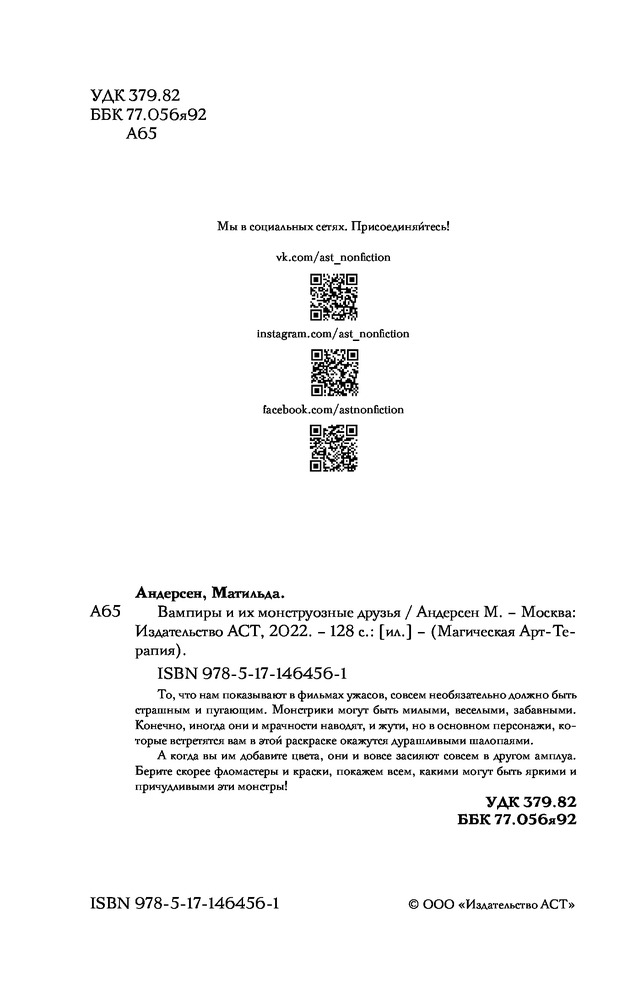 Вампиры и их монструозные друзьяВ данный момент этот товар отсутствует в продаже. Возможно, у нас найдется аналогичный или похожий товар здесь. Серия: Магическая Арт-Терапия То, что нам показывают в фильмах ужасов, совсем необязательно должно быть страшным и пугающим. Монстрики могут быть милыми, веселыми и забавными. Конечно, иногда они и мрачности наводят, и жути, но персонажи, которые встретятся вам в этой раскраске, скорее всего окажутся дурашливыми шалопаями. А когда вы добавите им цвет, то они и вовсе засияют в другом амплуа. Берите скорее фломастеры и краски — покажем всем. какими могут быть яркими и причудливыми эти монстры! |